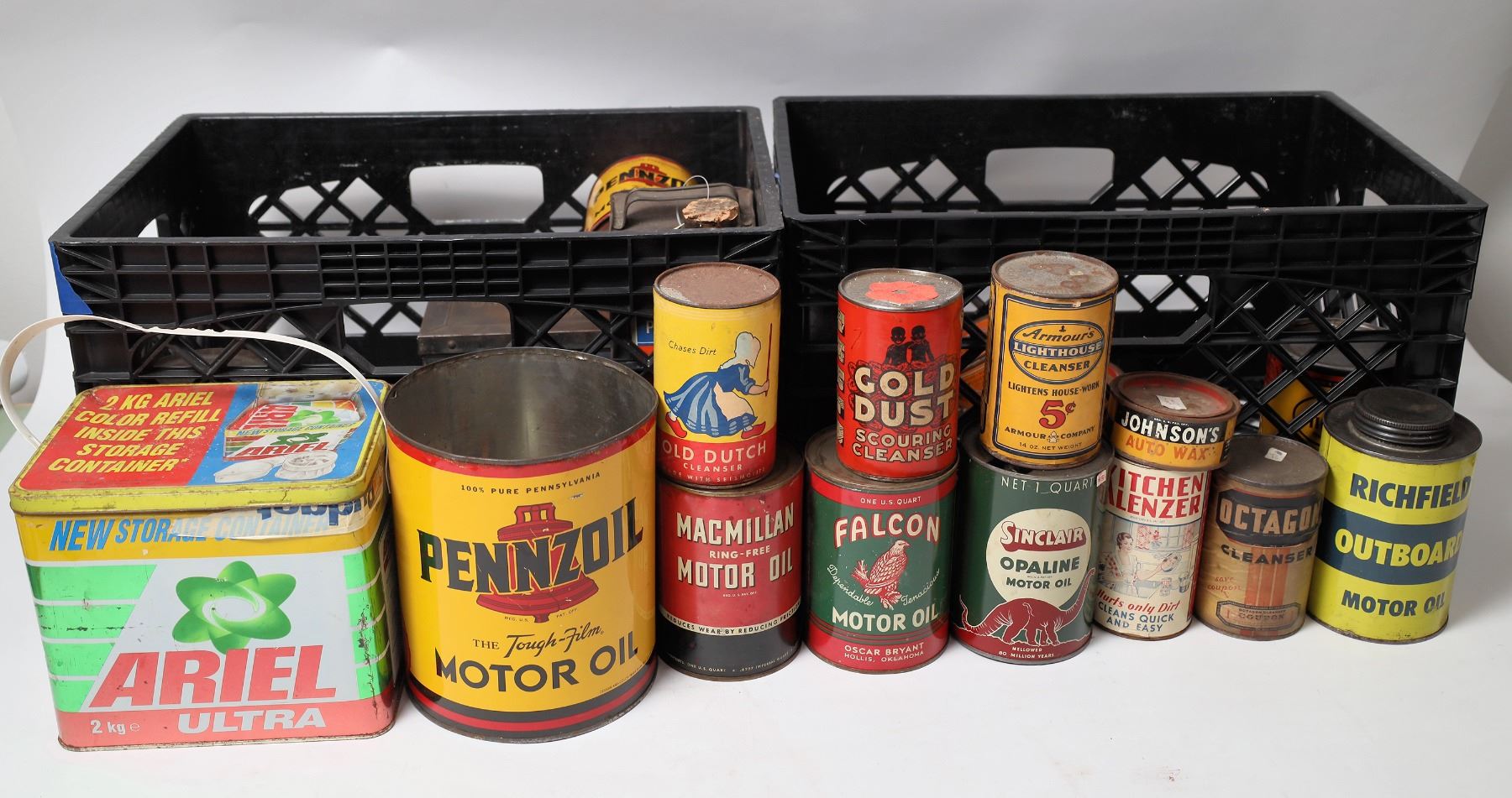 About 24 industrial cans in various sizes, some with contents. Simoniz, several Pennzoil, Gold Dust Twins-dented, Old Dutch Cleanser, Shell Outboard Motor Oil, Ariel Ultra, Penn seal Motor Oil, Eveready Prestone etc. From The Chilcoot General Store Collection.