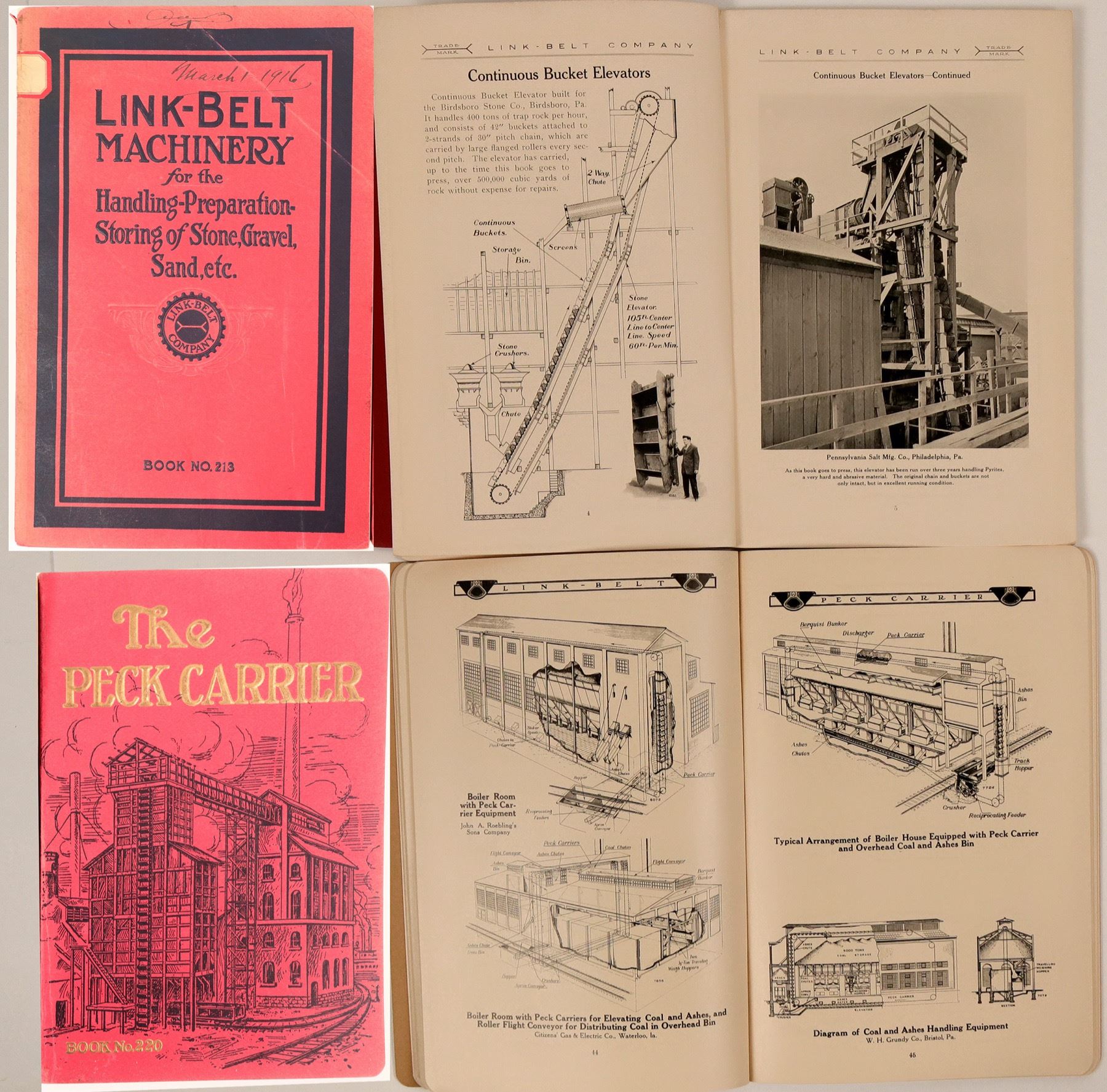 2) The Peck Carrier, Link Belt Co., Chicago Catalog No. 220. Carrier for Coal, Coke, Ashes, Cement, Sand, Ore, Stone, and other Materials. Includes renderings of Conveyor Systems and a wide range of in-use photos from a variety of plants. 1919. 6' x 9" stiff pictorial and embossed cover. 95 pages.