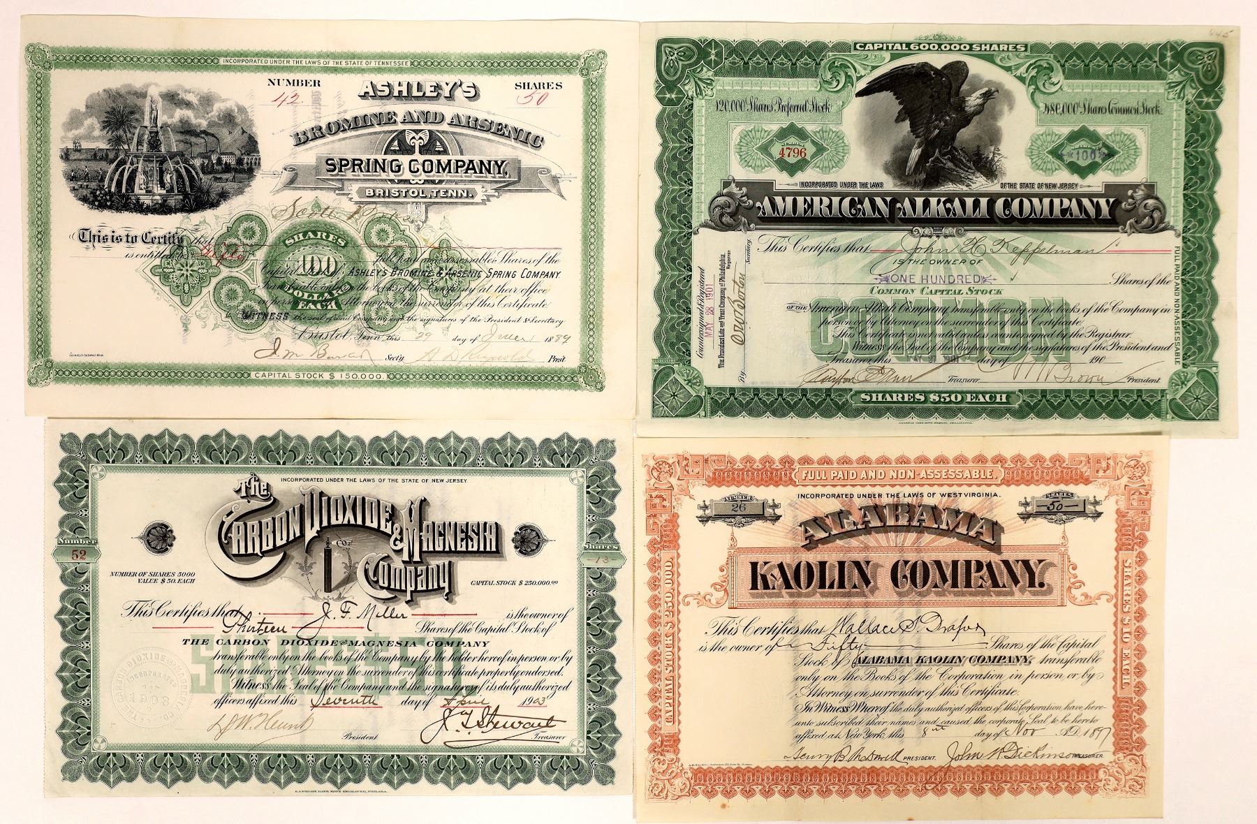 Lot of four industrial materials companies' stock certificates, from Eastern States, c1889-1903. Included are: Ashley's Bromine and Arsenic Spring Company, of Bristol, Tenn., No. 42, 50 shares issued June 29, 1889, uncanceled, signed by President H.D. Reynolds and Secretary, with ornate fountain vignette and border; American Alkali Company, inc. in New Jersey, No. 4796, 100 shares issued May 27, 1901, to John H. Keppelman, uncanceled, signed by the President and Treasurer, with embossed seal, eagle vignette and ornate border; Alabama Kaolin Company, inc. in West Virginia, No. 26, 50 shares issued Nov. 8, 1897, uncanceled, signed by President Henry B. McDowell and Treasurer John M. Dickinson, with embossed seal and ornate border; The Carbon Dioxide & Magnesia Company, inc. in New Jersey, No. 52, 13 shares issued April 7, 1903, to J.F. Miller, uncanceled, signed by President and Treasurer, with embossed seal, small CO2 canister vignette and ornate border. All in very fine condition with two slight folds each.