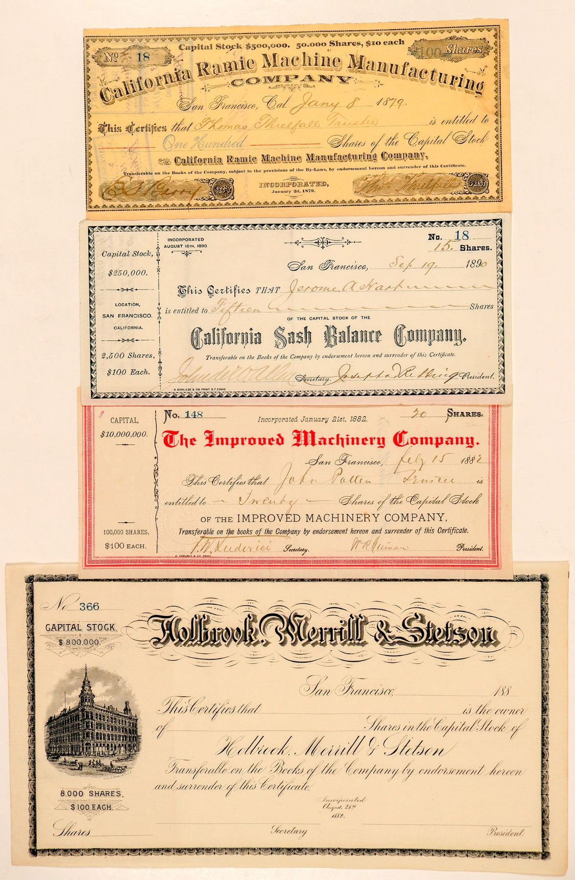 Industrial Revolution Stock Certificates from California. Lot of 4 different. Included: California Sash Balance Company (issued 1890, not cancelled); California Ramie Machine Manufacturing Company (issued 1879, not cxl); The Improved Machinery Company (1882, not cancelled); and Holbrook, Merrill & Stetson (1880s, unissued, pictorial). Very good condition. Please inspect.