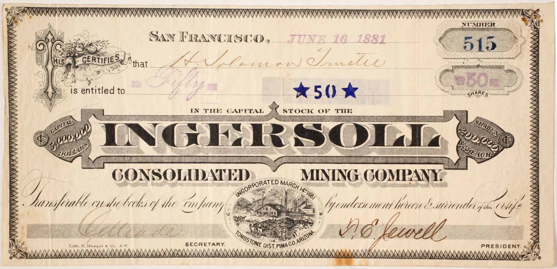 # 515 for 50 shares to H Solomon Trustee. Signed by C Meade and president TE Jewell. Dateline San Francisco 1881. Incorporated March 14, 1881. Location of mine Tombstone Dist., Pima Co., Arizona. Not cancelled. E Bosqui printer. Mill scene inside incorporation information. Pin holes, some staining (bottom center) and folds. Original trustees included Egbert Judson, Joseph Noland, TE Jewell, John Conly, FA Benjamin, WW Williams, and F Martin Smith. The first assessment was in November of 1881. In December of 1882, Solomon was delinquent of 259 stock certificates - each at least 50 shares! He was in good company as original trustees Conly, Jewell, Judson and Williams were also delinquent. Secretary C. Read was delinquent. When the trustees, president and secretary are delinquent on a stock, you know it was worthless! Prag Collection State: Arizona City: Tombstone Date: 1881 HWAC# 86019