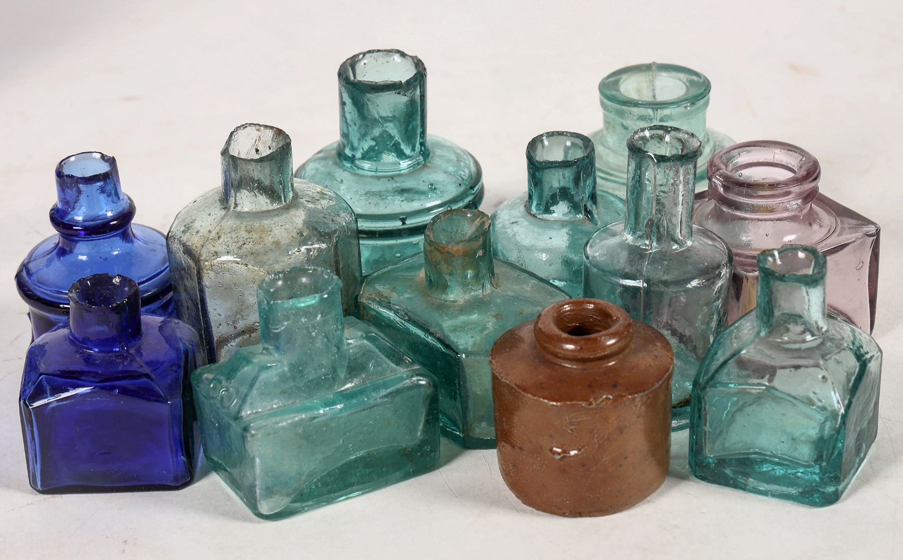 About 21 ink bottles. Aqua, cobalt and amber. 2" to 9.75". About 9 have lip chips etc. See photo. Please inspect.