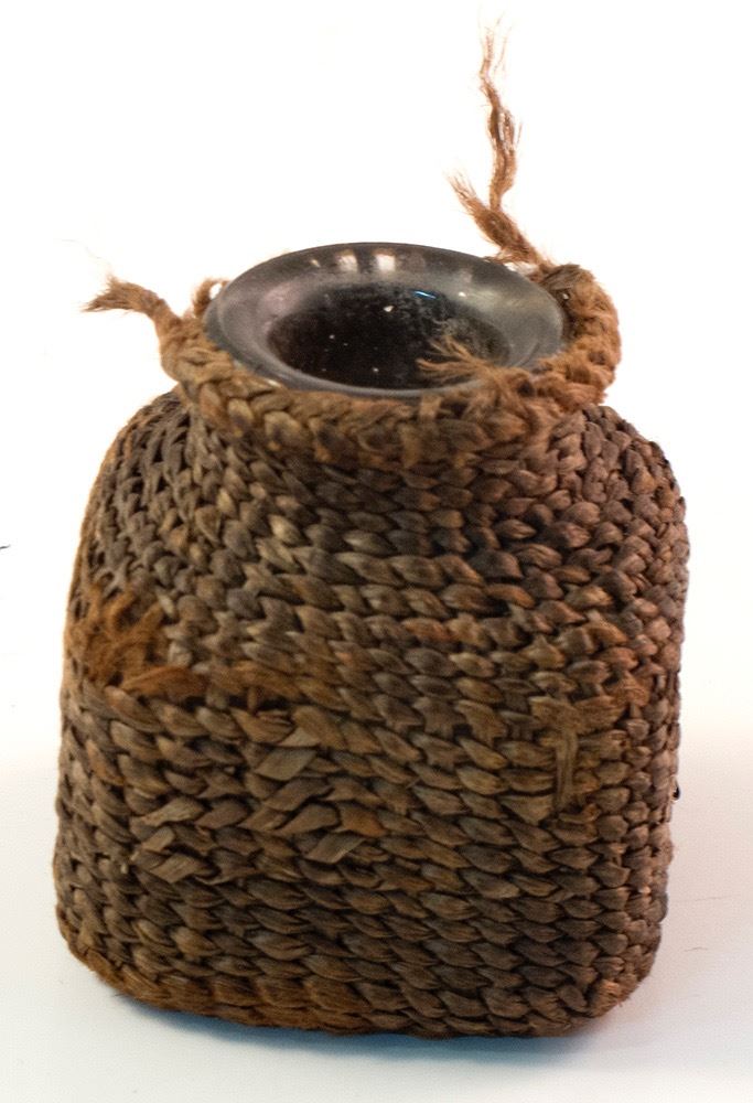 Very old ink bottle, woven over. Weaving is worn on top edge. 2" high x 1.75" square. Possibly Paiute made, no design, plant fiber, pitch. HWAC# 40350 Date: Location: