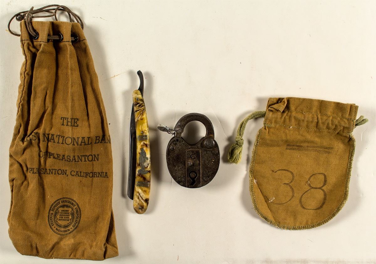 1) Jaqueline, Made in German, #3971. Beautiful inlay (silver or nickel silver) with a full frontal nude of Jaqueline on handle. Still sharp!. 2) Railroad Lock, no key. Working on lock is hard to read: "? H. W. Olim...New..." 3) Two money bags including First National Bank of Pleasanton. City: State: California Date: hwac# 35666