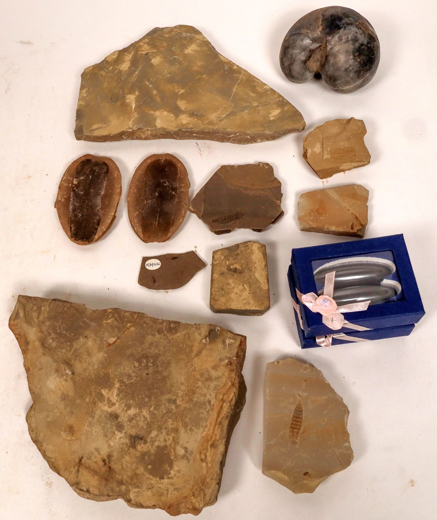 Lot of 12. Two boxes of magnitite, one bivalve, insect fossils largest is 7x6x1Ó China Chunlin Zhu Collection