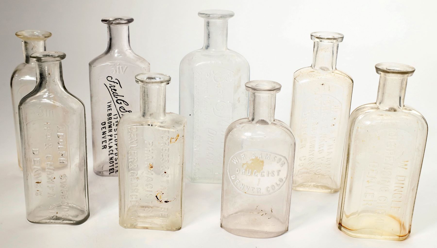 Too many to list individually. Only two of the smaller bottles have very small rim chips. All the others are damage free. Three have content residue on the interior . About half of the bottles have either interior or exterior haze. Please see the photos for this wide assortment of quality Denver medicines.