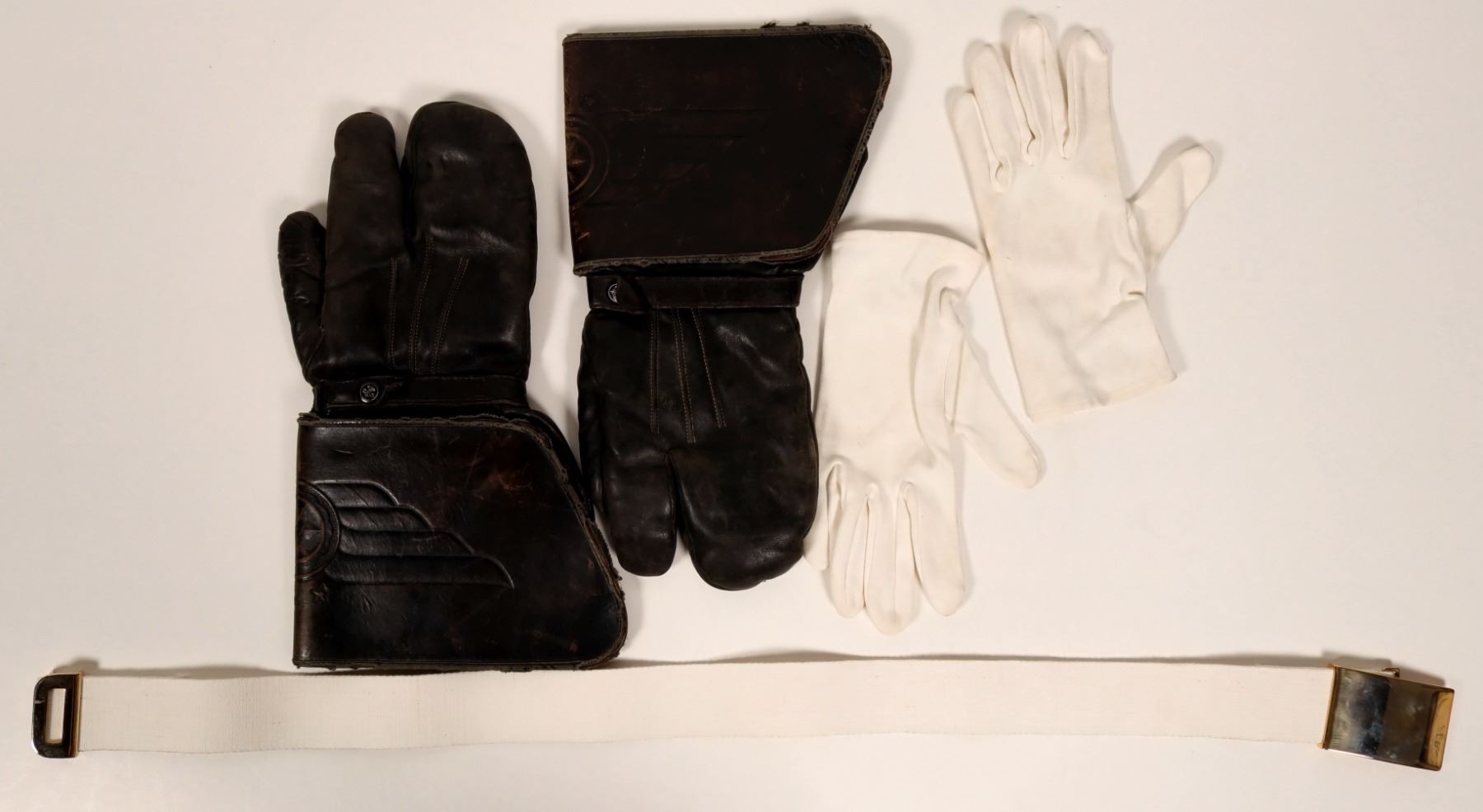 Used pair of heavily insulated leather gauntlet gloves with separate thumb and index fingers and mitten for the the other three fingers, size large. Worn but quite serviceable and made for handling extreme weather. Fit is adjustable with a snap fitting. Also in this lot is a pair of white, heavy cloth gloves, size medium, and a white cotton webbing belt with polished brass fittings, length 34 inches from clasp to hook.