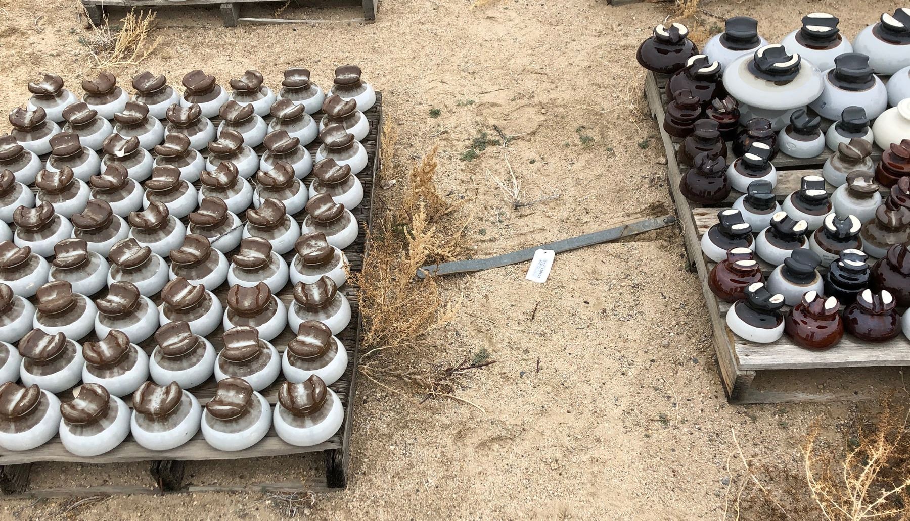 2 pallets of insulators. variety, about 60 of the gray brown 5", and 4" brown ceramic on up on the other pallet, about 55. (F.O.B. Fish Lake Valley, Nevada)