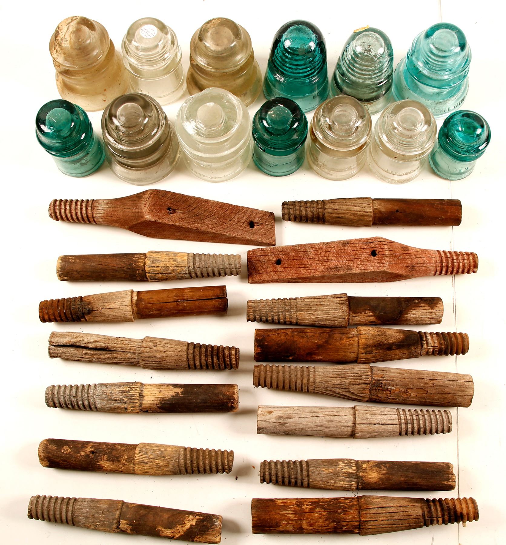 Lot of assorted insulators. Hemingray #9,light green; AT&T American Telephone & Telegraph toll insulators (2); 1 Hemengray Beehive in green; 2 Hemingray (B) Beehive aqua color,1 whitall tatum #1,light green, clear glass insulators (various styles). 15 insulator dowels. Some are common & some are not so common.