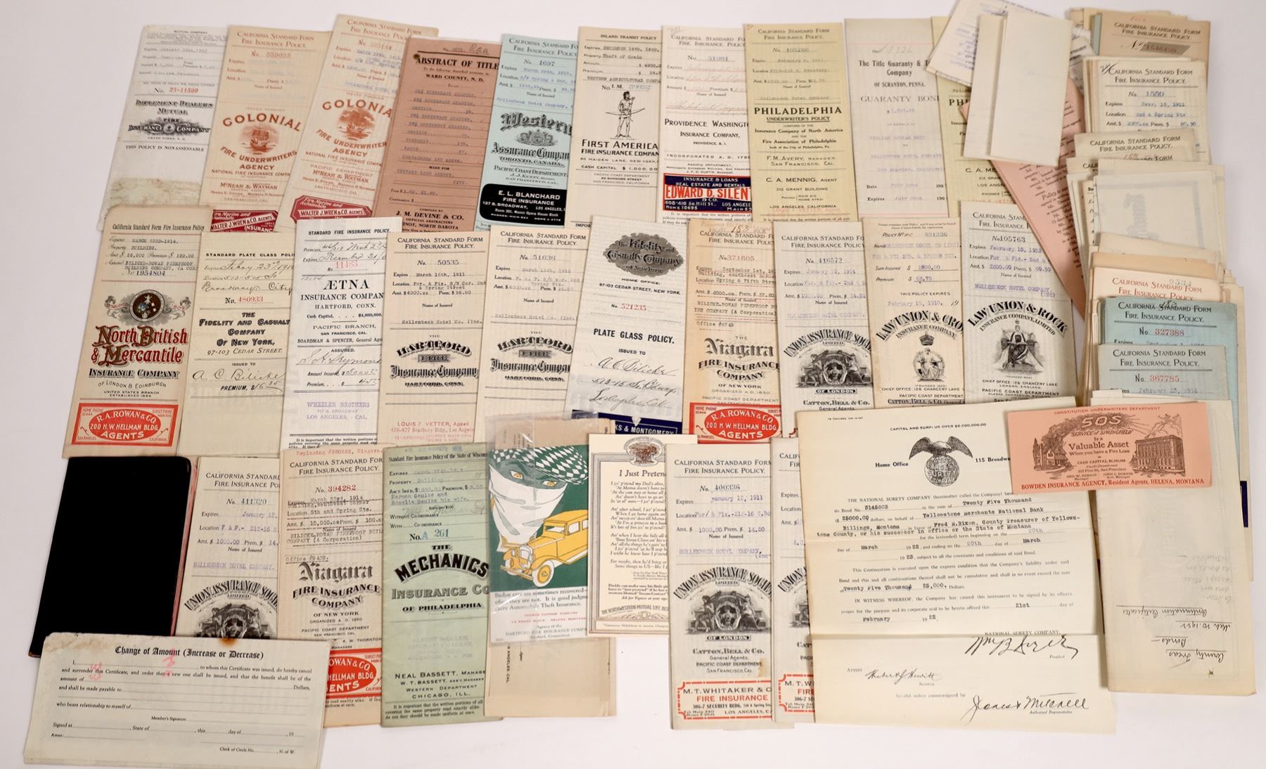 lot of 82. These are all issued insurance policies for fire, mortgage , title guarantee, plate glass, Insurance. The policies have the company logos and, once unfolded, can be large. Companies: Neighbors in Woodcraft, Colonial Fire, Firemen's Fund, Fidelity and Causality Co., The Mechanics Insurance Co, Niagara Fire Insurance, Aetna, The Hartford and many others. Two ad cards: Hartford Fire Insurance for auto theft. Northwestern Mutual for life insurance w/sad little girl on front and poem about her dad. One 1908 Insurance Agent rate book. A demand letter from Anaconda Shriners Club Montane demanding either payment or return of tickets to the dance. State: City: Date:1908-31 Provenance: Stuart Mackenzie Montana Ephemera Collection