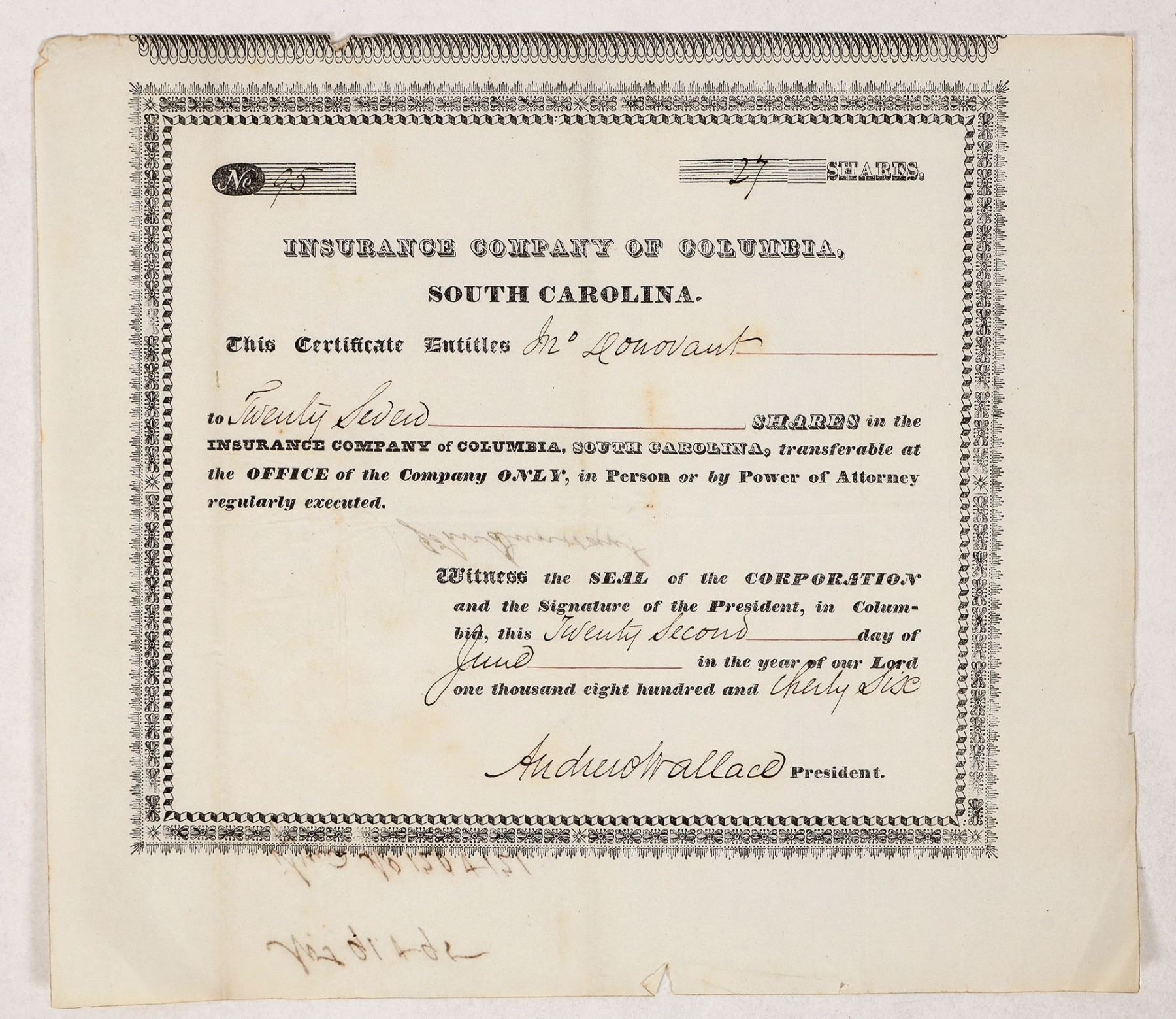Issued 1836 Insurance Company of Columbia, South Carolina stock. Some edge small creases, tears etc. Please inspect.