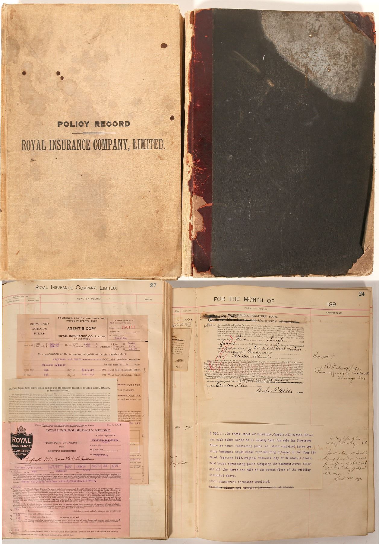 Here we have two giant , old style insurance ledgers, 16 3/4" tall x 12" in size. Item # 1 of 2: The Norwich Union Fire Insurance Society. Very interesting reading. Also, includes may receipts and paper work there in. The binding is worn, with the bottom right corner cover missing. The upper right corner has water damage as well , 7" of it. The spine is covered, but weak.Back cover is missing. Item # 2 of 2: Royal Insurance Company: The cover is beige, spotted , and stained, both the front and reverse. The spine has a few openings in it. Otherwise in good condition. Both items have very good quality, inside pages. Good table top, display items. ( RH ) . City: Clinton State: Illinois Date: 1890' to 1920's
