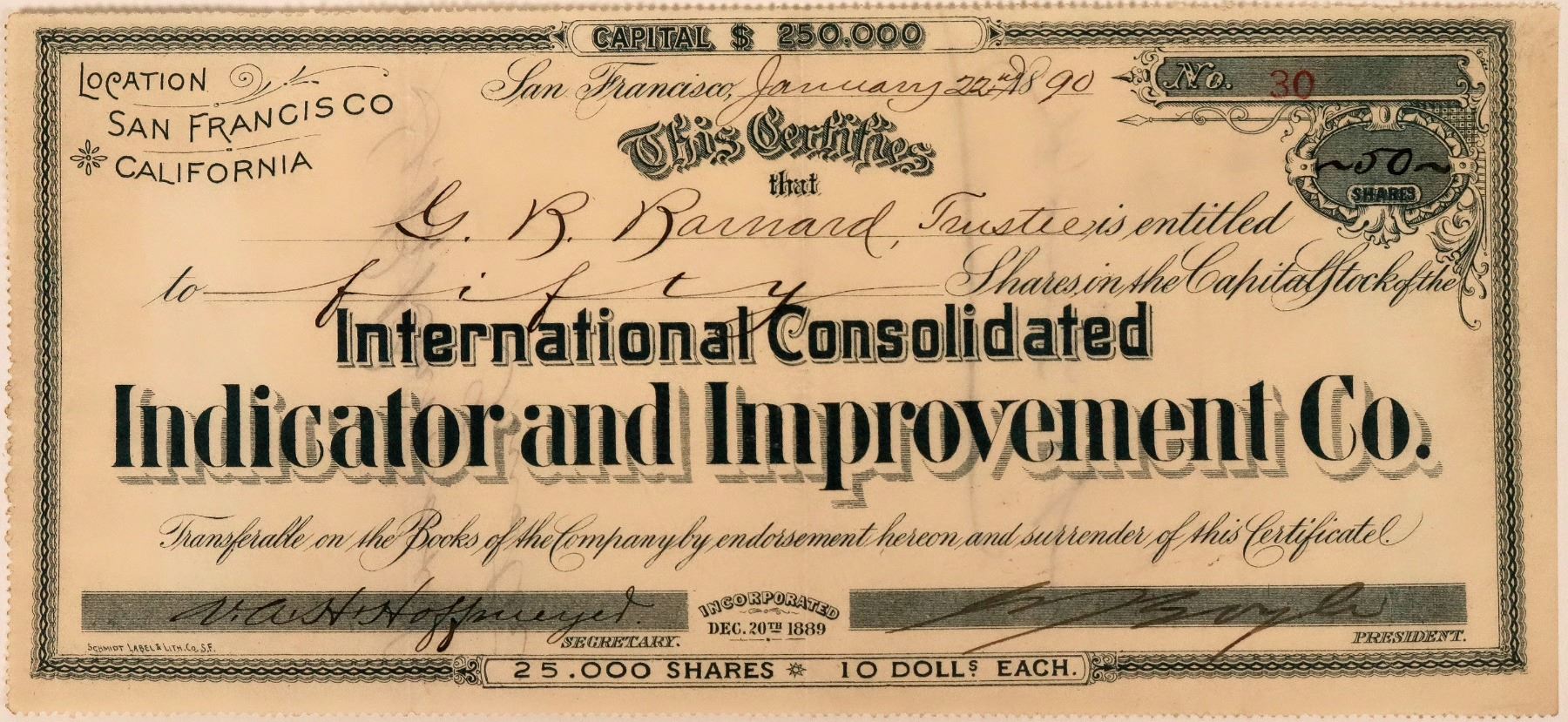 Cert. #30, issued for 50 shares at San Francisco in 1890. We could find no reference to this company in our research. Location: San Francisco, California printed at top left. Black print on creme. Schmidt Label & Print, S.F. printer. In excellent condition. Uncancelled.