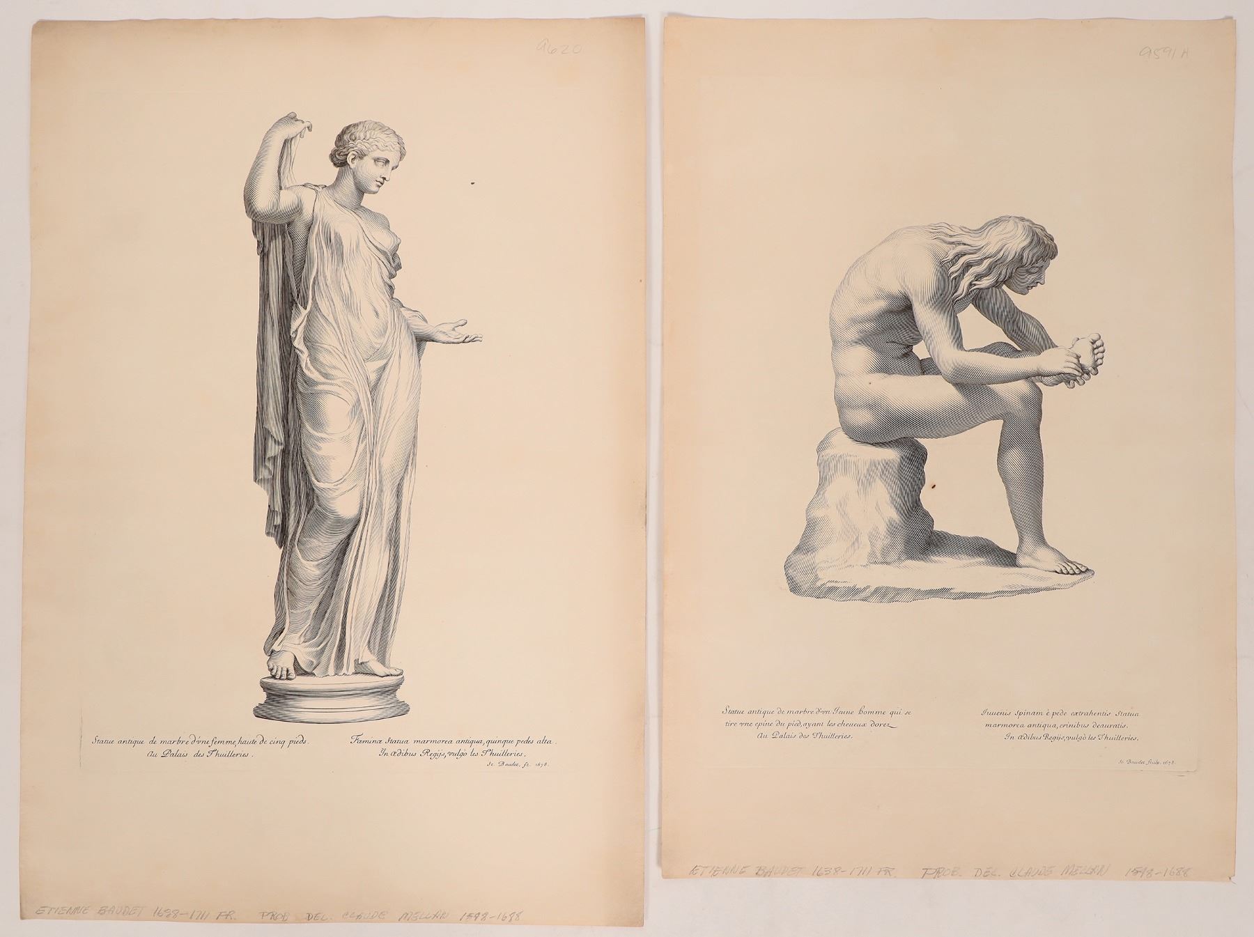 (2) Intaglio prints by …tienne Baudet, Circa 1600's. Baudet is a French engraver 1638-1711. The prints read in both French and Latin, "Antique marble stature of a young man pulling a thorn from his foot, with gilded hair, at Tuileries Palace, St. Baudet sculpt. 1678", and "Antique marble statue of a woman, five feet high, at the Tuileries Palace, St. Baudet sculpt. 1678". Paper watermarked. 12.5x19 in., 13.75x20 in.