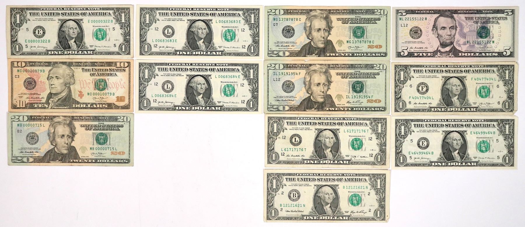 $82 face value U. S. Currency with interesting serial numbers: Two double repeater one dollar bills; three low serial number notes: $1, $10, $20; three pair of semi repeater serial numbers: two $20, two $1. Three mirror notes: two $1, one $5.