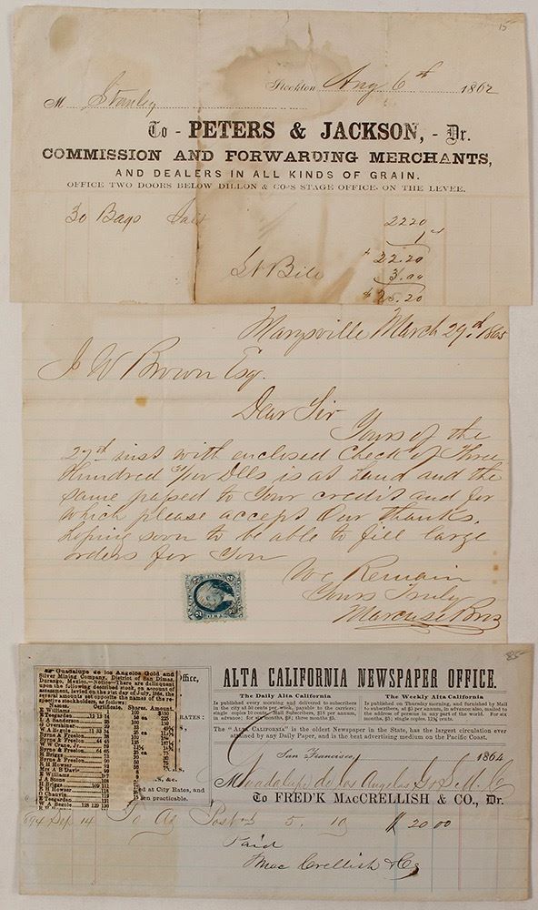 1) Lot of three. 1) Letter from Marysville, California in 1863. Acknowledging check received for $300/ From Marcus(?) Brothers to JW Brown. 2) 1862 Peters & Jackson Commission Agent billhead. Stockton, California. 3) 1862 Alta California Newspaper Office. To Frederick MacCrellish & Company. About the Guadalupe de los Angelos Gold and Silver Mining Company. Includes part of the delinquent list they the Alta printed in their newspaper. Interesting! Datelined San Francisco. Date: 1862-1864 Location: California HWAC# 57368