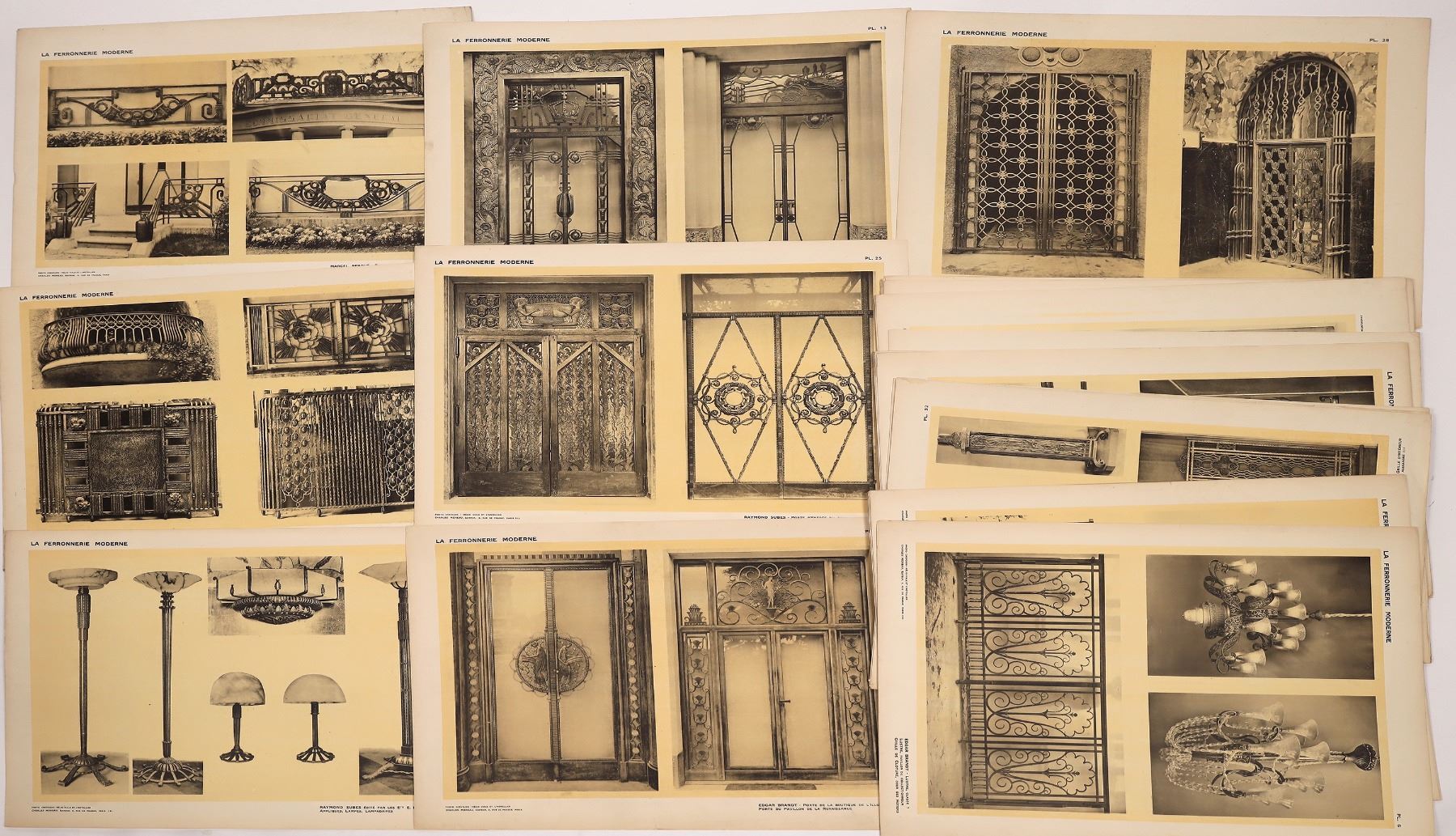 Group of about 32 lithographic prints featuring images of French interior design and architecture. They are pages that were originally from a book called La Ferronnerie Moderne, a French book about modern ironworking. These pages feature wrought iron design elements and furniture. They are 17.25 x 12.5, good condition.
