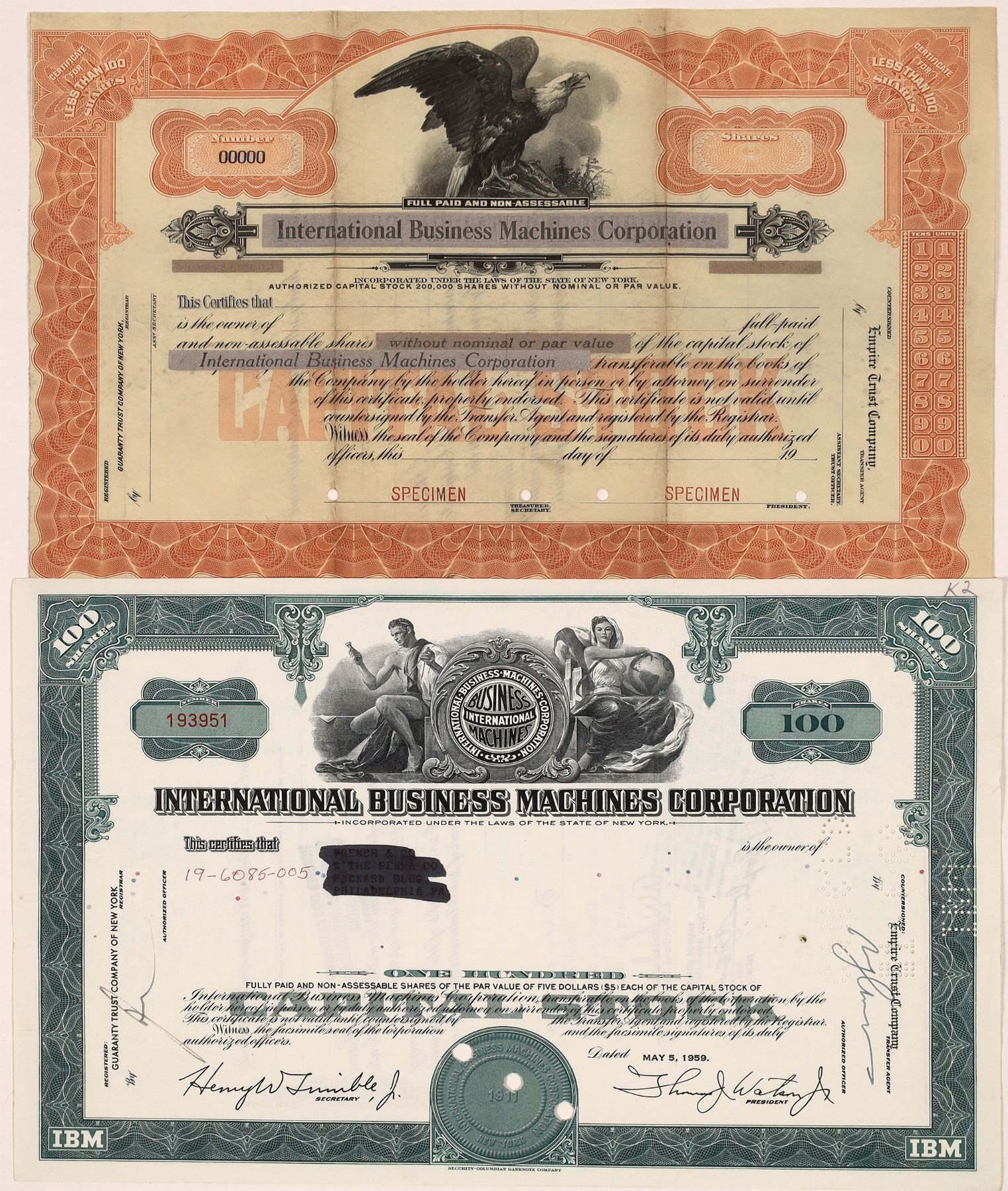 Lot of two International Business Machines Corporation, New York, stock certificates. Included are: unissued, canceled Specimen certificate with orange ornate border and eagle vignette, blank, in good condition with folds and some staining; and No. 193951, 100 shares to French & Co. (with owner blacked out on front), canceled in 1968, signed by President Thomas J. Watson, Jr., and Secretary Henry W. Trimble, Jr., green ornate border and vignette, fine condition with slight fold. See photos for details.