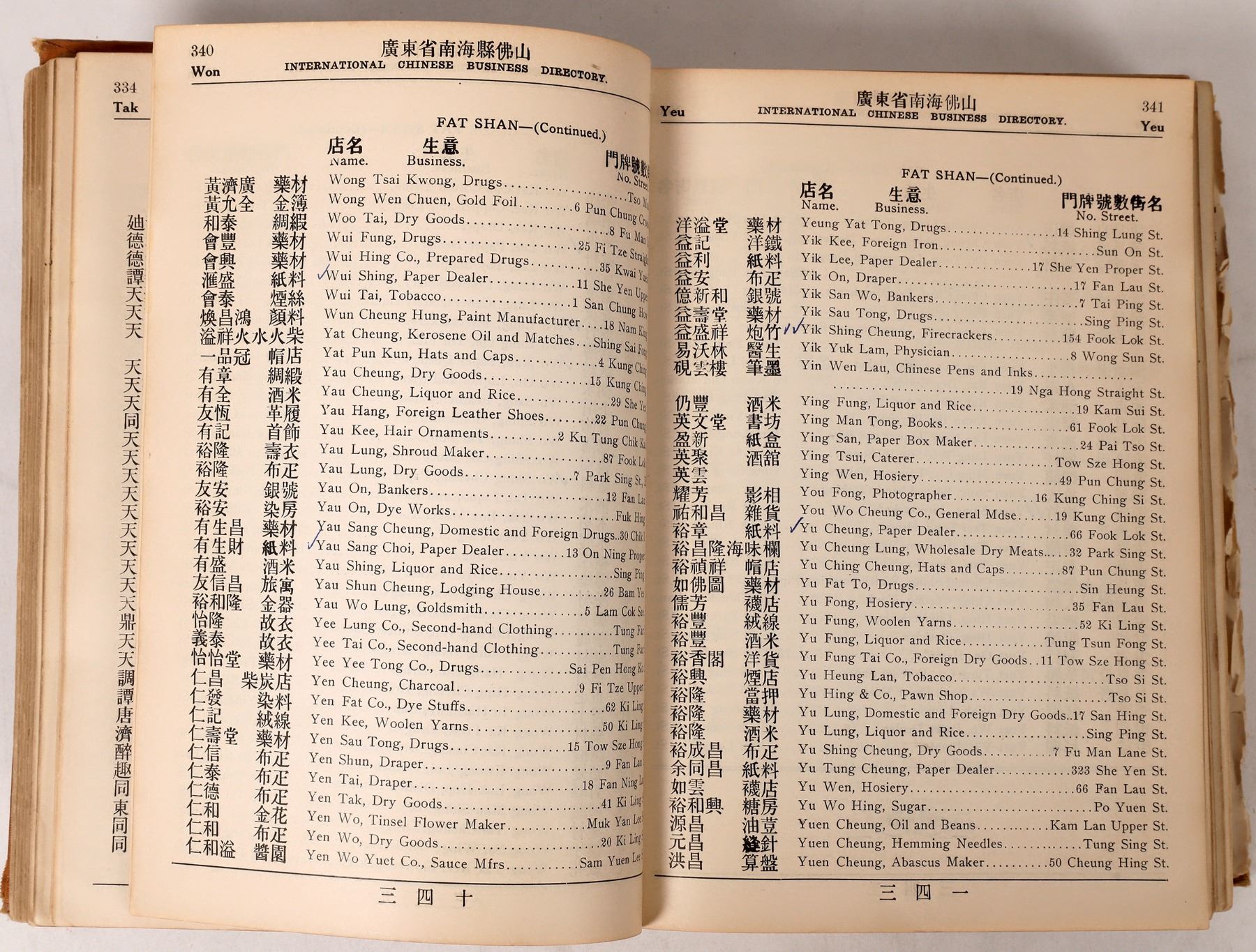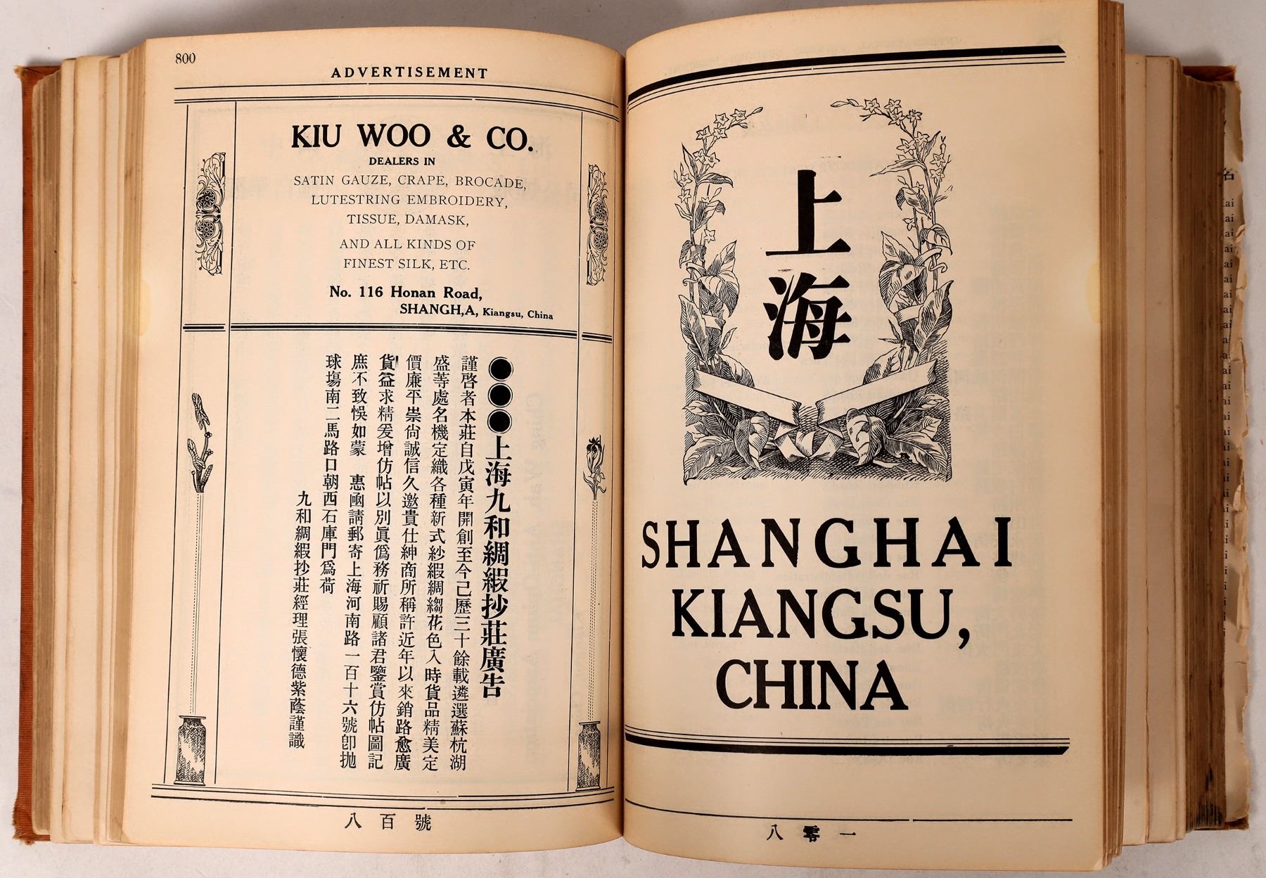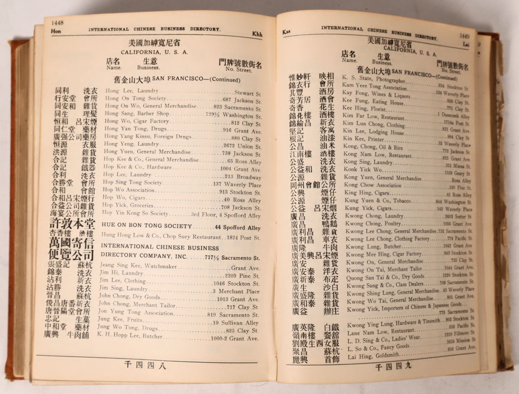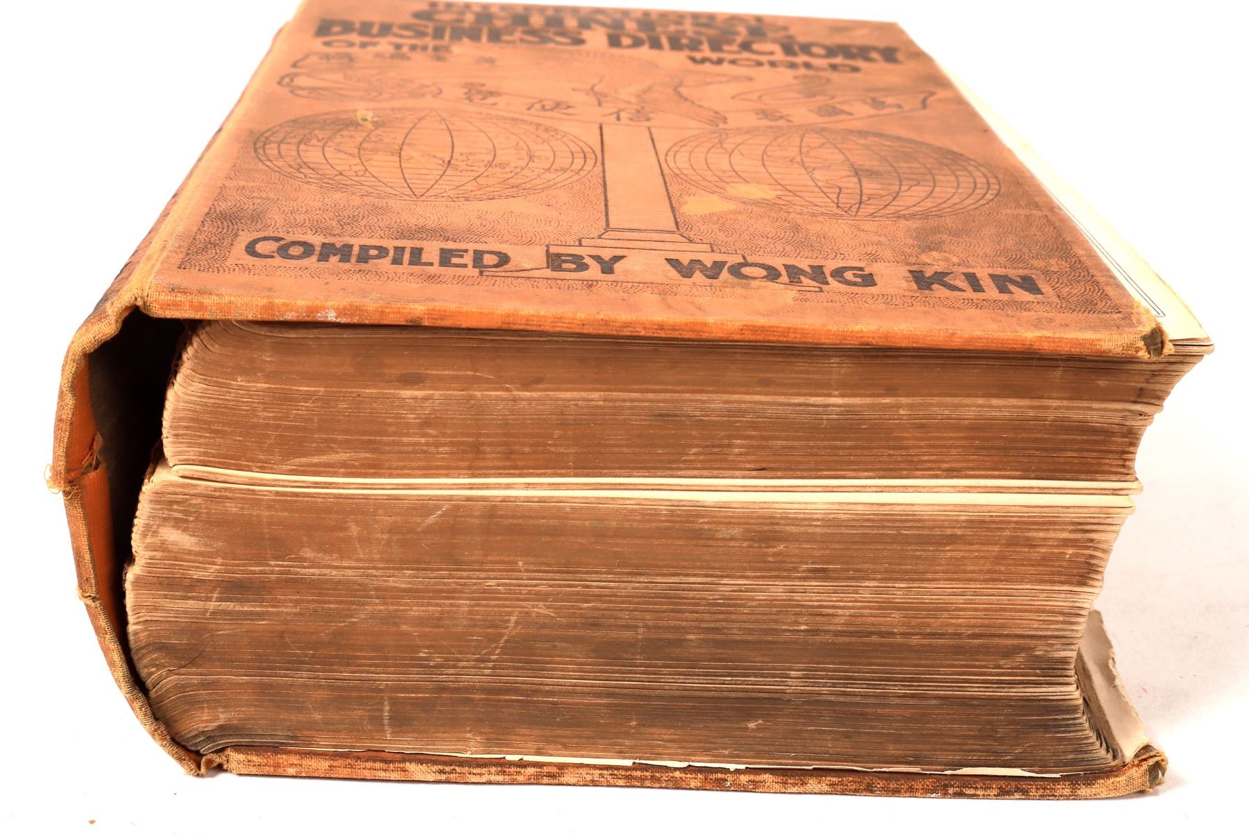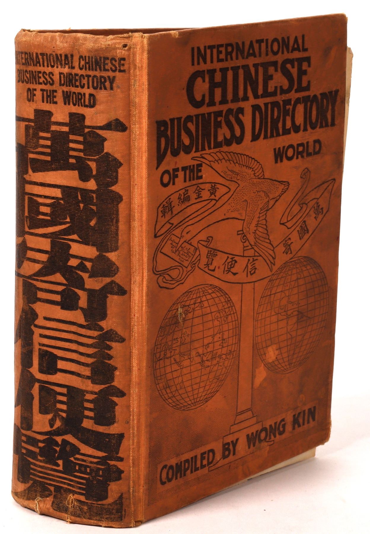Very rare International Chinese Business Directory, published in San Francisco in 1913. Compiled by Wong Kin. Large sections on major Asian cities including Canton, Shanghai, Hong Kong, Macau, plus many smaller Chinese cities as well. Hanoi, Laos, Tonkin, Penang, Singapore and Seoul also featured. There is also a large California section by city. Most continents and countries of the world are here including India, Africa, Australia, Canada, Mexico, the Philippines, and South America. Each individual listing is in Chinese and English by city. Also, a large index at the front along with a large section of advertisements from different businesses. Approximately 1,700 pp. The numbered pages ends in the high 1,500's but there are about 100 pages to the rear that are unnumbered. The covers are in nice condition. The binding is loose and there are two pages that are disbound. This is a wonderful reference book for the historian. We could find no copies of this book on the main used book site, so this is very rare.
