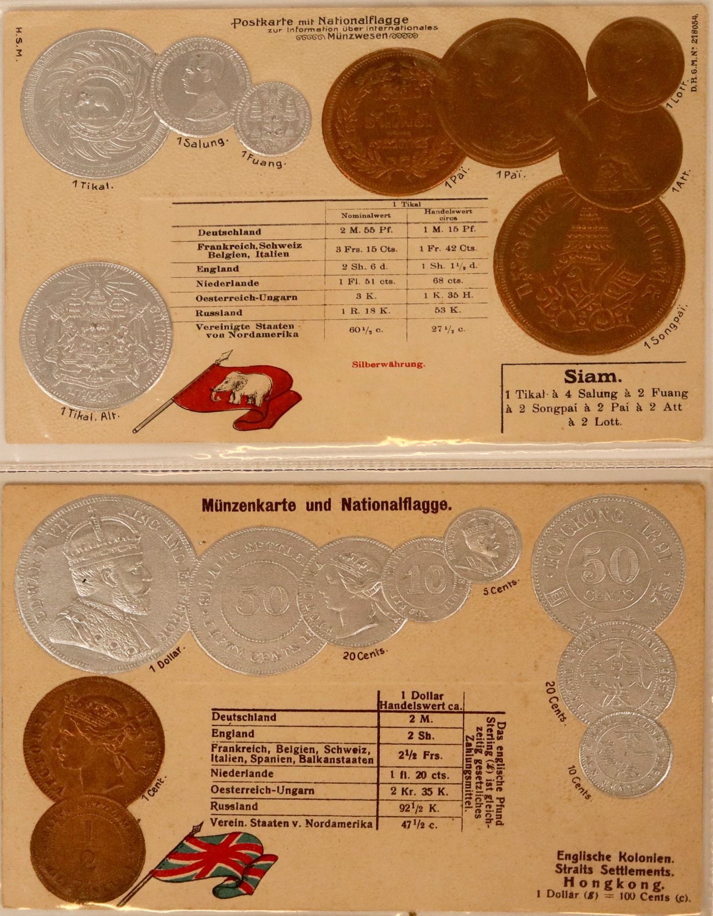 Lot of two post cards featuring the coinage and national flag of: Siam and Hongkong.