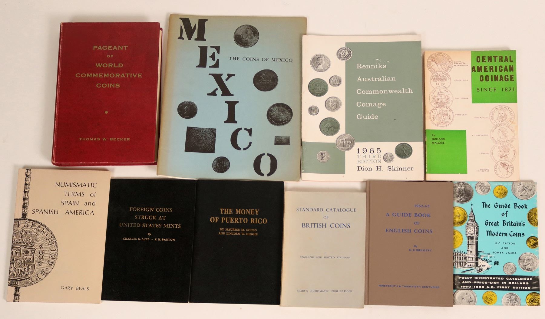 Lot of 10, nicely illustrated. Included: The Money of Puerto Rico, Gould and Higgie, 1962, sc; Standard Catalogue of British Coins I., Seaby, 1962 first edition; Numismatic Terms of Spain and Spanish America, Beals, 1966, first edition, sc; The Guide Book of Great Britain's Modern Coins, Taylor and James, 1961, sc; Central American Coinage Since 1821, Wallace, 1966, sc; Pageant of World Commemorative Coins, Becker, 1962, hc; Foreign Coins Struck at United State Mints, Altz and Barton, 1965, sc; A Guide Book of English Coins, Bressett, 1962, hc; and two others.