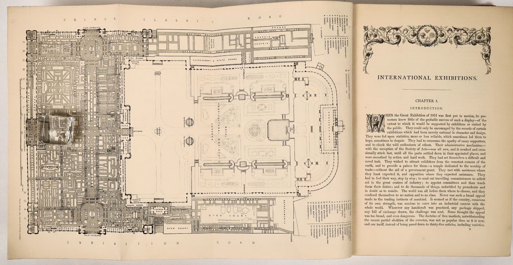 A copy of 'The International Exhibition of 1862, Volume I, Illustrated Catalogue of the Industrial Department', a book documenting the history and exhibits of this event. The book includes a concise history of the International Exhibition as a tradition as well as an extremely detailed, illustrated catalogue of the inventions displayed at the Exhibition. Sections include devices for agricultural manufacture, railway technology and other transportation, factory machines, and machinery for mining. While the pages are in overall good condition, the cover has been detached (though is still included with the book), and there is significant wear of the spine.