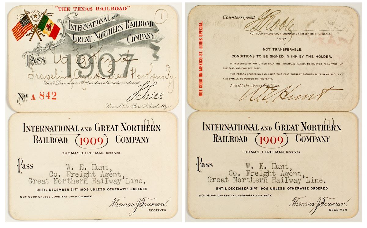 Lot of two. 1) Colorful pass with raised pictorial of Texas and US flags. Pass No. A842, issued for 1907 to W.E. Hunt (Great Northern Railway).Countersigned by G.L. Noble. Endorsed by Hunt. Cardstock with soiling. 2) 1909 pass, also issued to Hunt. Countersigned by J.B. Heafer. Endorsed by Hunt. Cardstock with soiling and stains. (Prag Collection) City: State: Texas Date: ID# 41058