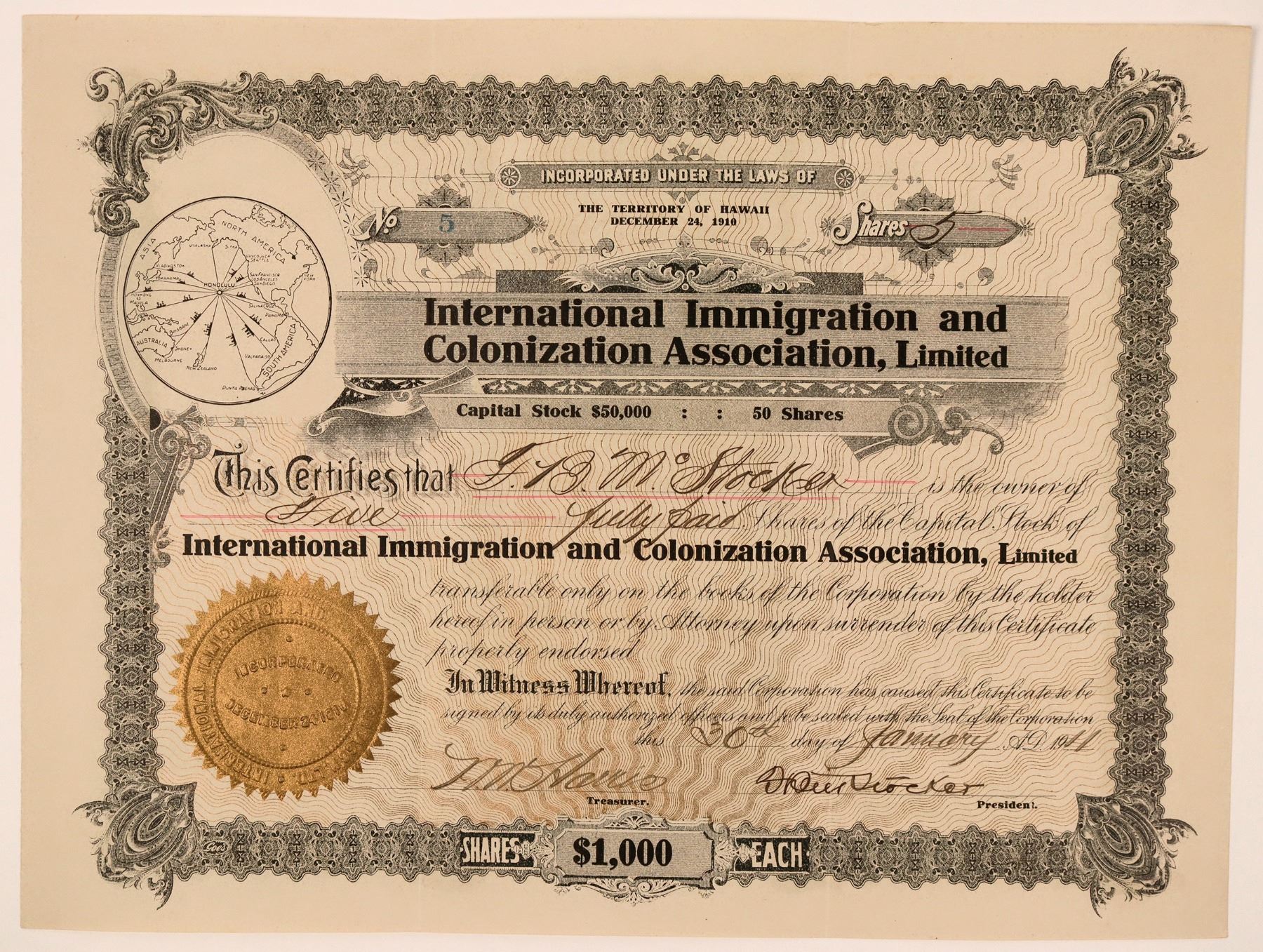 Incorp Dec. 24, 1910 . Committee on Immigration and Naturalization during 1911, entered into an agreement with the International Immigration and Colonization Association for the introduction of small parties of Russian immigrants. … During the period in which the agreement existed, 266 Russians were brought into the Territory . Issued and Uncancelled, certificate # 5 for 5 shares issued Jan. 30, 1911, Black, gold seal, Capitol limited to only 50 shs of $1,000 each. Left vignette of a map of the Pacific with trade route lines all drawn toward the central point of Honolulu. Gold sunburst underprint. Goes printer. Rare. EF