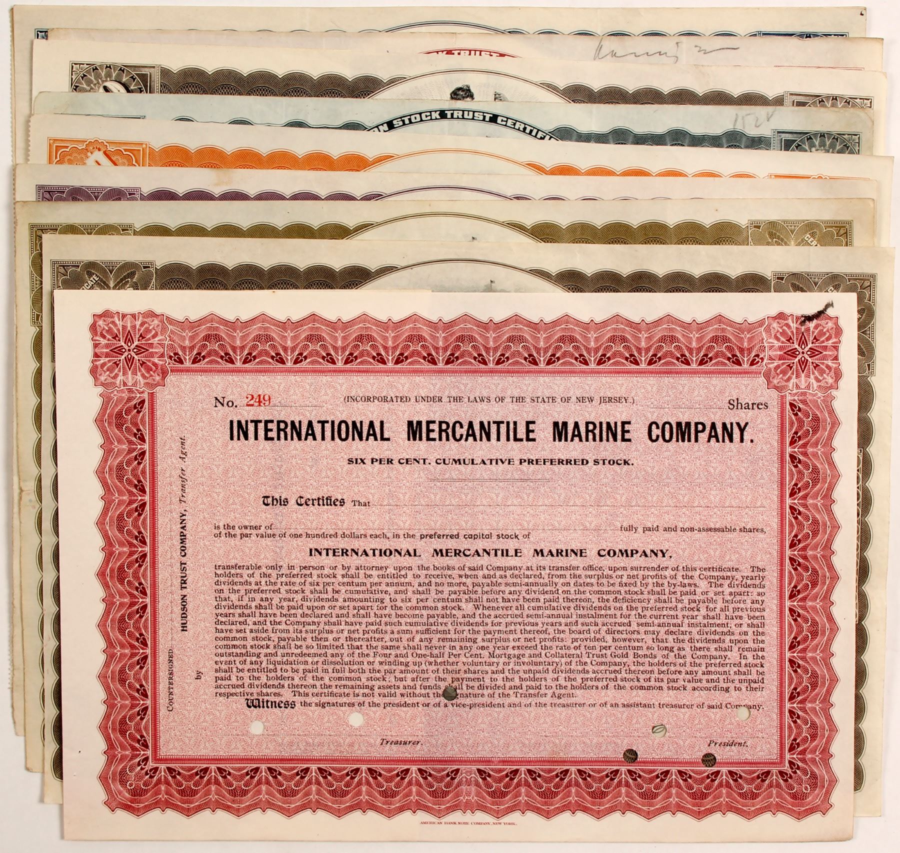 Originally the International Navigation Company it was a trust formed in the early twentieth century as an attempt by J.P. Morgan to monopolize the shipping trade. It's flagship was the ill fated Titanic. 1 unissued Mauve, 3 brown, olive, purple, orange, green, blue, mauve, blue. Prag Collection. State: City: Date: HWAC# 83465