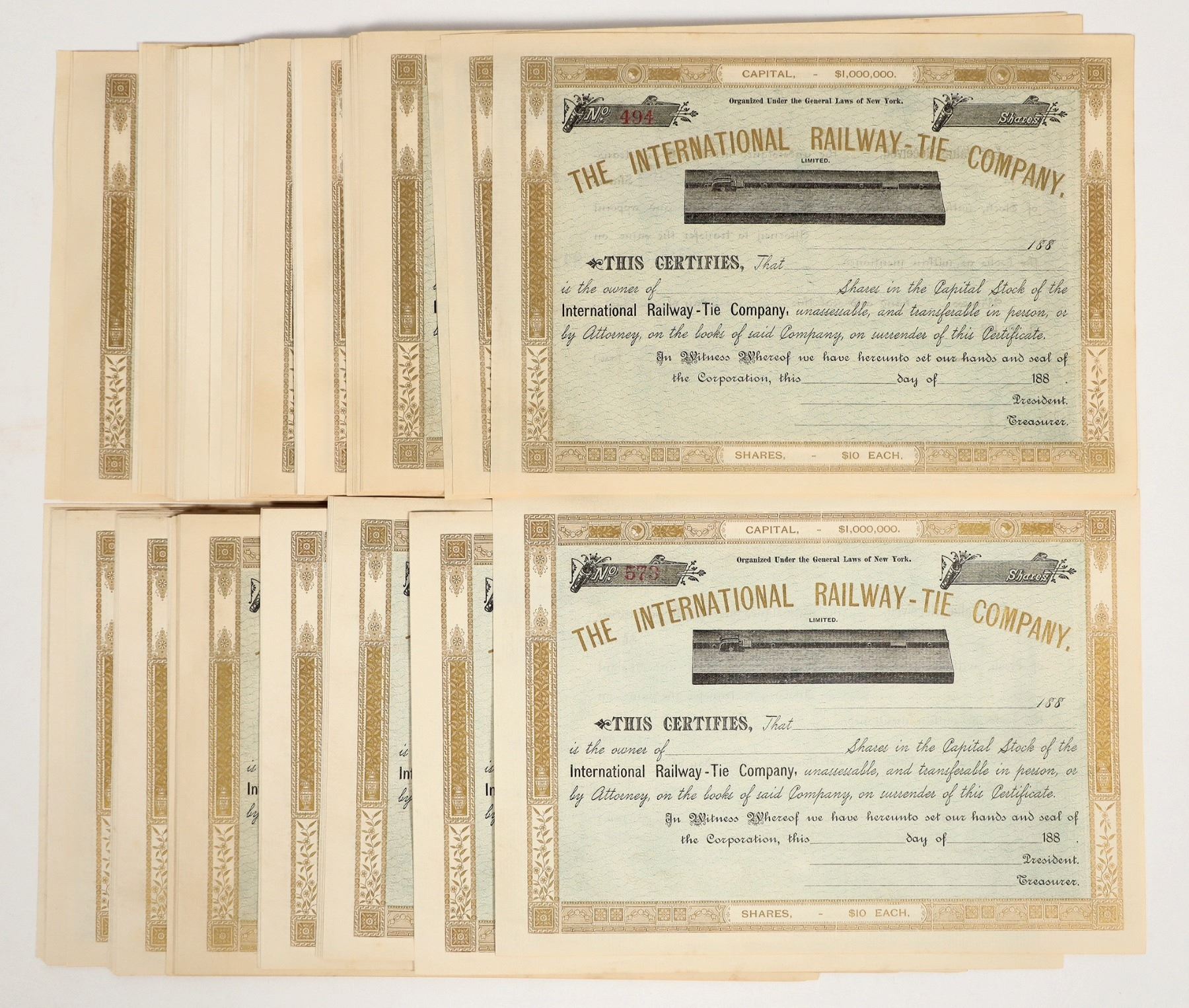 About 50 unissued stock certificates in The International Railway-Tie Company. Gold ink, railway tie vignette, 10 x 7 inches. The "International Railway-Tie Company" was a company from the late 1800s that produced experimental steel ties, but it is no longer in operation.