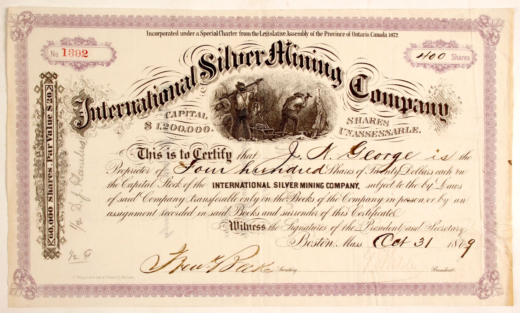 1 certificate total. Incorporated in Ontario, Canada, signed and NOT canceled out of Boston, Mass.; in good condition, nice purple trim with a black and white background, stock vignette of two miners at work.