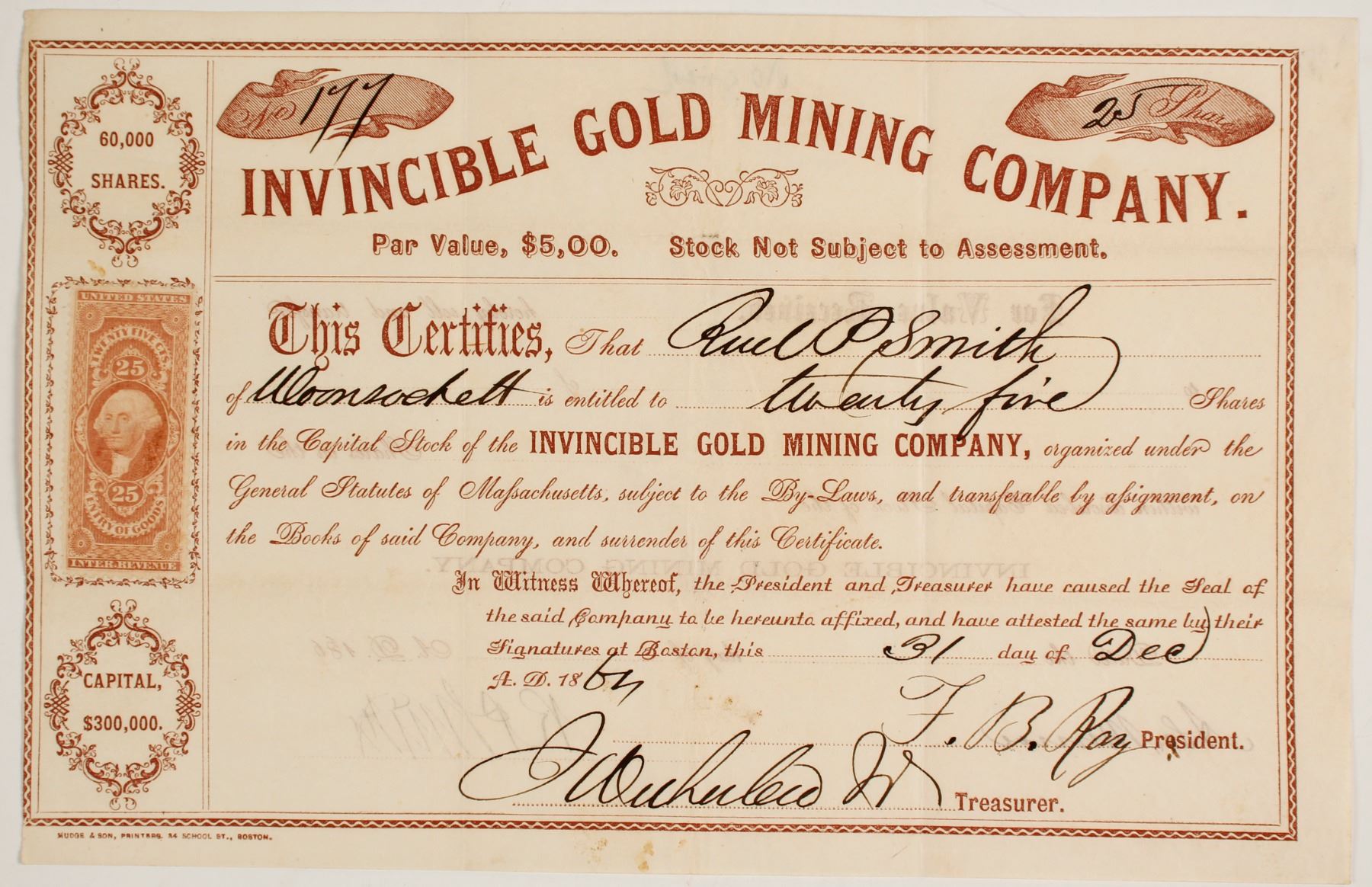 The two Invincible mines we found that make sense to us were in Summit and Teller County in Colorado. Unfortunately the date of the stock is not easily readable, so the exact mine is difficult to determine. # 177 for 25 shares to Smith. Signed by treasurer (?) and president FB Ray. Datelined December 31, 18-- in Boston. Printed by Mudge & Son. Minor discoloration near bottom. Otherwise very fine. State: Colorado City: Date: 1864