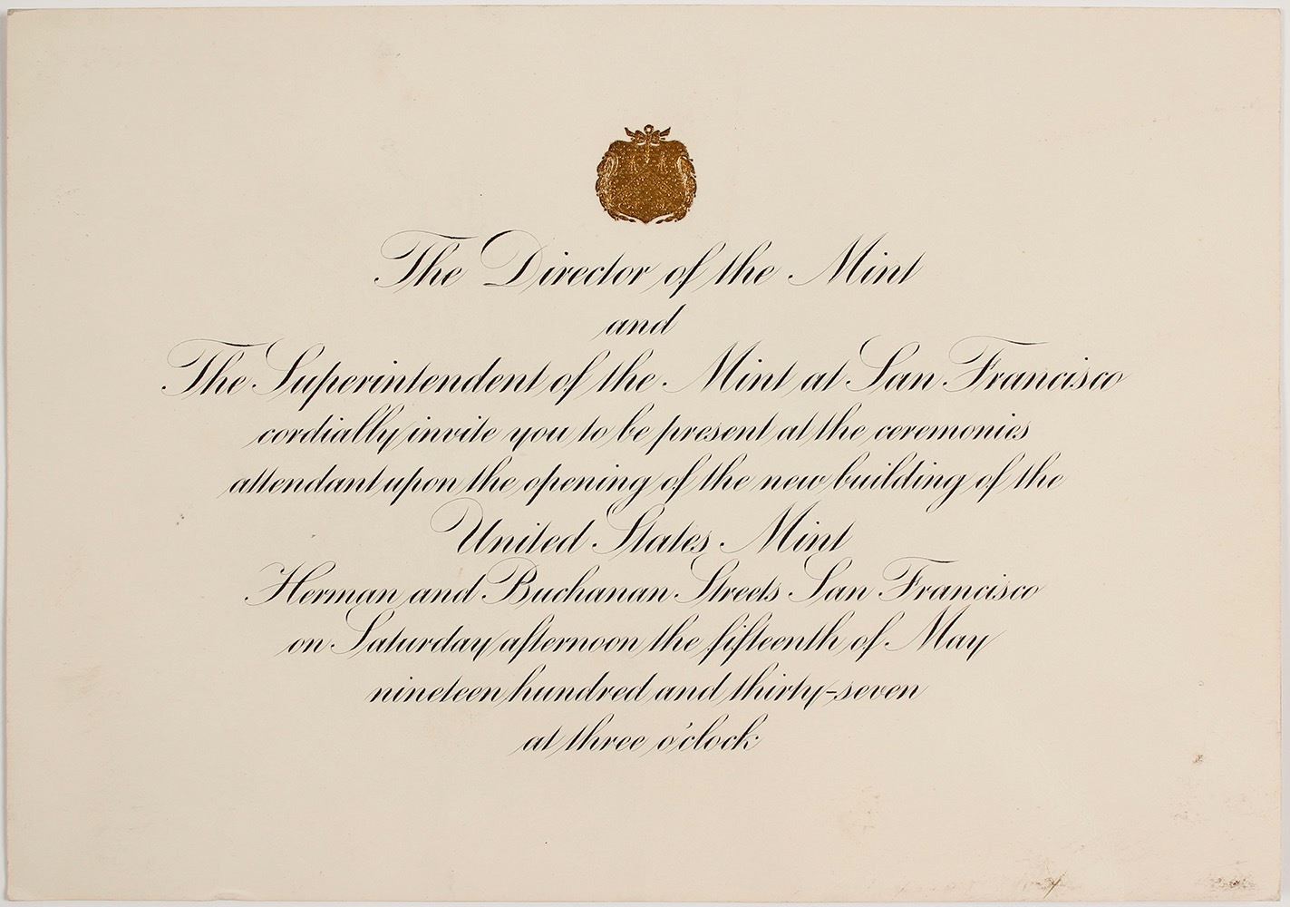 "The Director of the Mint / and / The Superintendent of the Mint at San Francisco / cordially invite you to be present at the ceremonies/ attendant opon the opening of the new building of the / Unitred States Mint / Herman and Buchanan Streets San Francisco / on Saturday afternoon the fifteenth of May / nineteen hundred and thirty seven / at three o'clock" 7 3/4 x 5 1/4 inches. HWAC# 61648 Date: 1937 Location: San Francisco, California