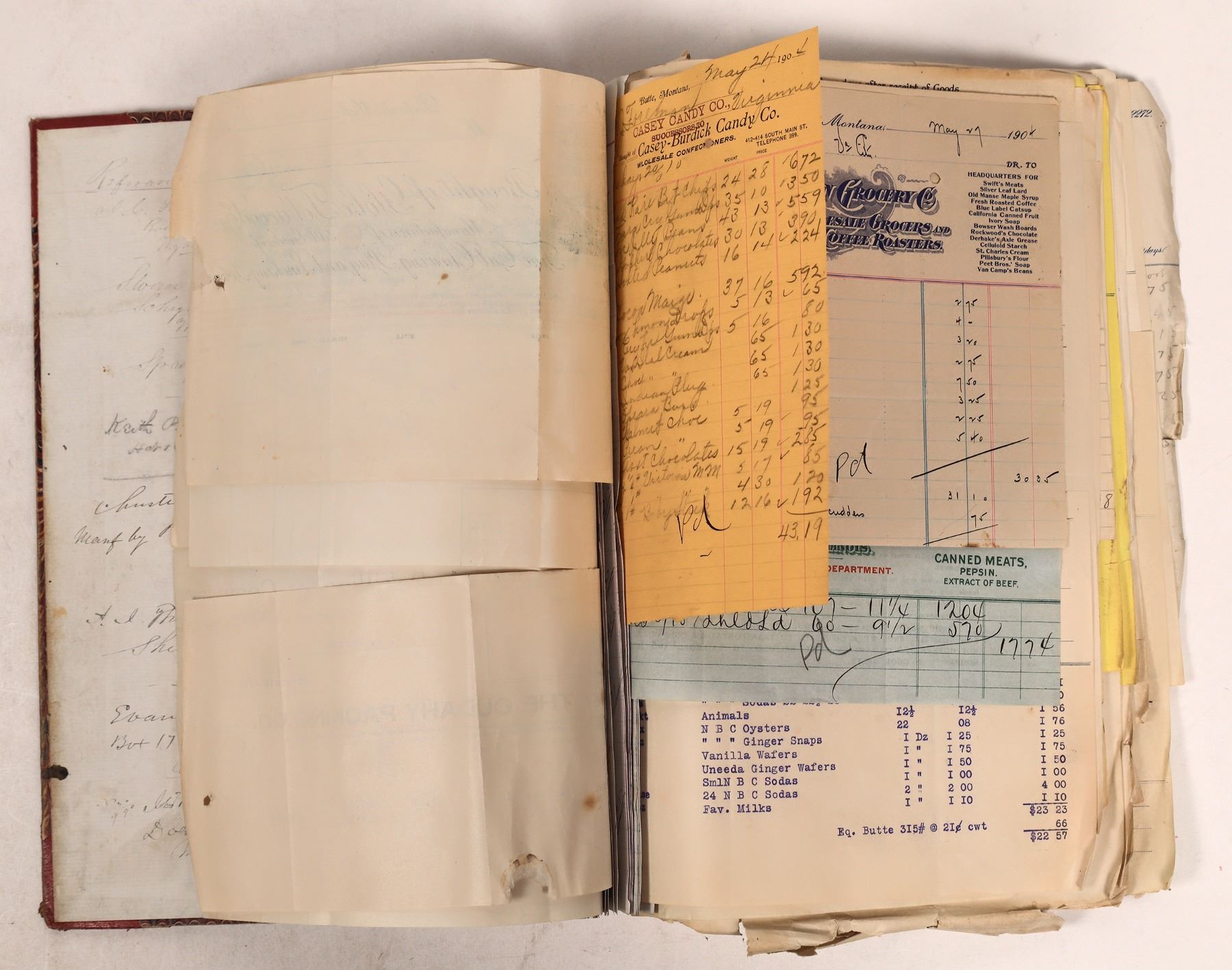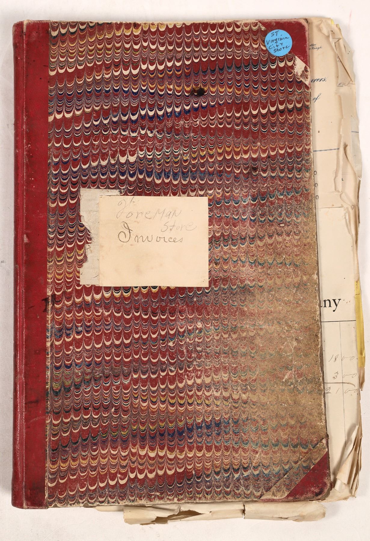 Invoice ledger with billheads from businesses providing inventory for the W. J. Foreman store in Virginia City. 1904-1905. About 30 billheads.