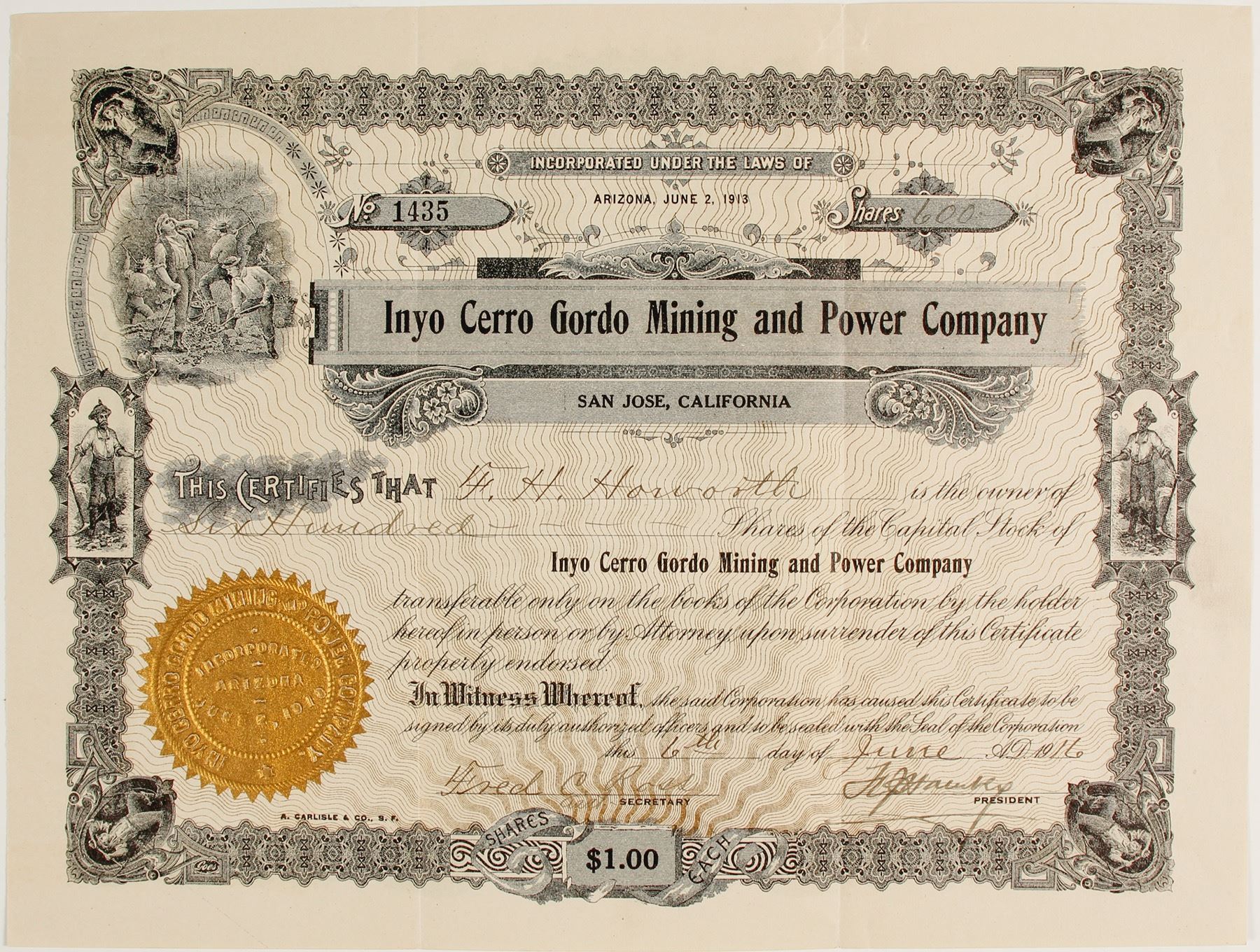 Cert. #1435, issued in 1916 to F.H. Howorth for 600 shares.This company took over the operations of the Four Metals Mining Company which included the Union mine at Cerro Gordo and was the principal owner of the Cerro Gordo Mines Company (1914). Signed by F.J. (Frank) Hambly as president. Hambley was president of both companies. The famous Cerro Gordo silver mine dates back to the 1860's and partly financed early Los Angeles. The Four Metals Mining Company had built a smelter east of Keeler and an aerial tramway from the mine to the smelter. By 1917, the Cerro Gordo mine had become a large zinc producer and had over 28 miles of tunnels and drifts. In 1916, there were 60 men employed at the mine.