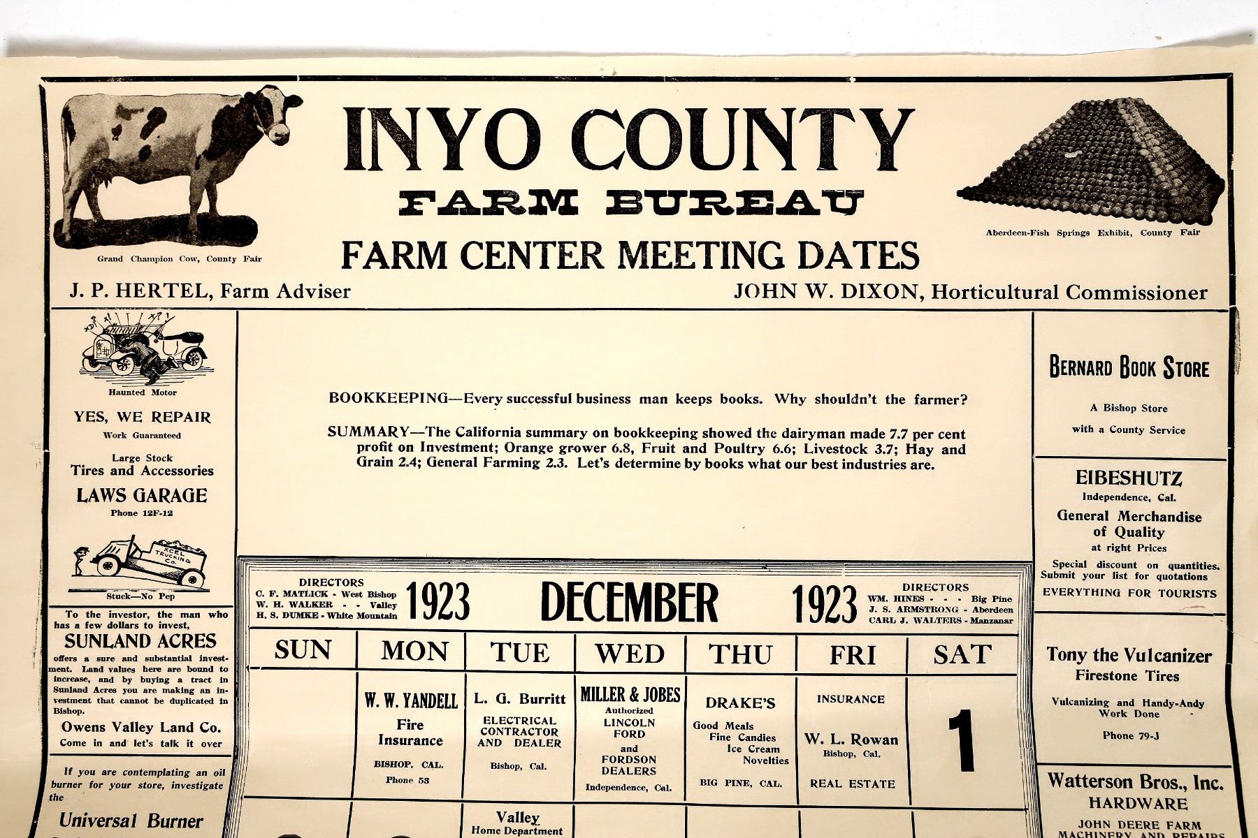 December, 1923 Inyo County farm bureau calendar advertising blotter. 22x17".[ Inyo County California