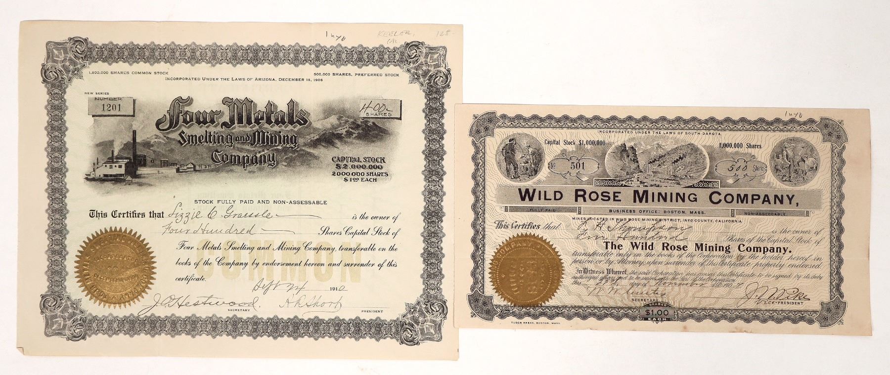 1910 Four Metals Smelting and Mining. Property included the famous Union mine at Cerro Gordo consolidated with the old Santa Maria mine and now called the Cerro Gordo mine. . Silver lead ore. Shipped ore from 600' and 800' levels in 1910 (Copper Handbook, 1910). The Cerro Gordo mine was located near the summit of Cerro Gordo peak. The Four Metals company erected a smelter east of Keeler and built an aerial tramway from the mine to the smelter. There were said to be 28 miles of tunnels and drifts in the Cerro Goro mine. Very rare certificate. Vignette shows aerial tramway running from the mountains down to the smelter.