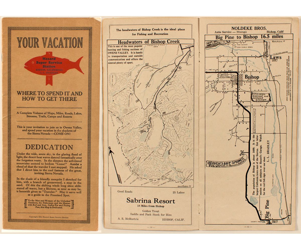 Hazard Super Station map to the recreation areas in Inyo County. Includes fishing at Bishop Creek, scenic drive from Big Pine to Bishop, Mono Lake, Tioga Summit, etc. Plenty of ads.