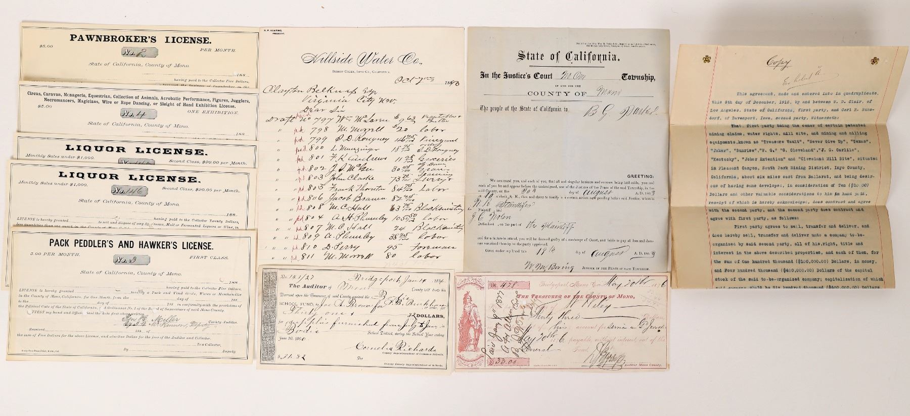 10 pieces of Inyo and Mono ephemera, c. 1863-1915, mostly older. Receipts, land sale contract, Hillside water bill statement, 5 unissued business licenses, legal notice etc. California Inyo & Mono County