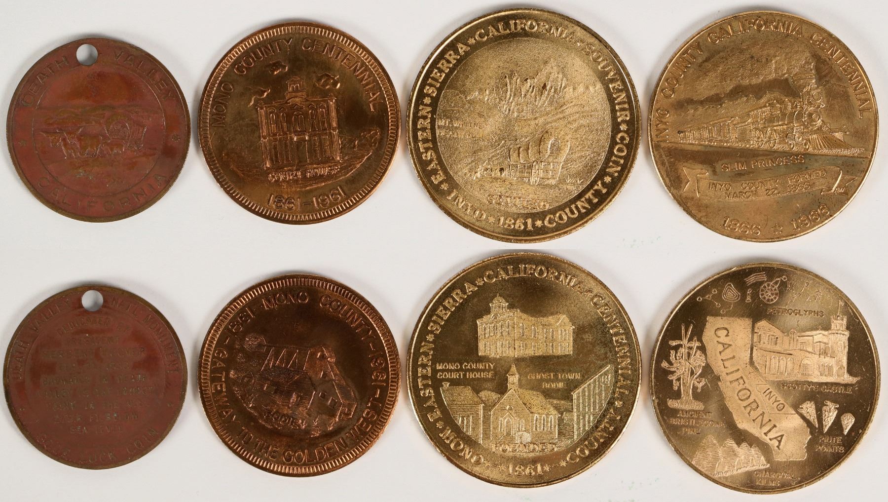 Lot of four: 1) 1966 Inyo County Centennial, 38 mm; 2)1961 Mono County Centennial, 38 mm; 3) 1961 Mono County Centennial, 33 mm; 4) Death Valley California, 30 mm, holed.