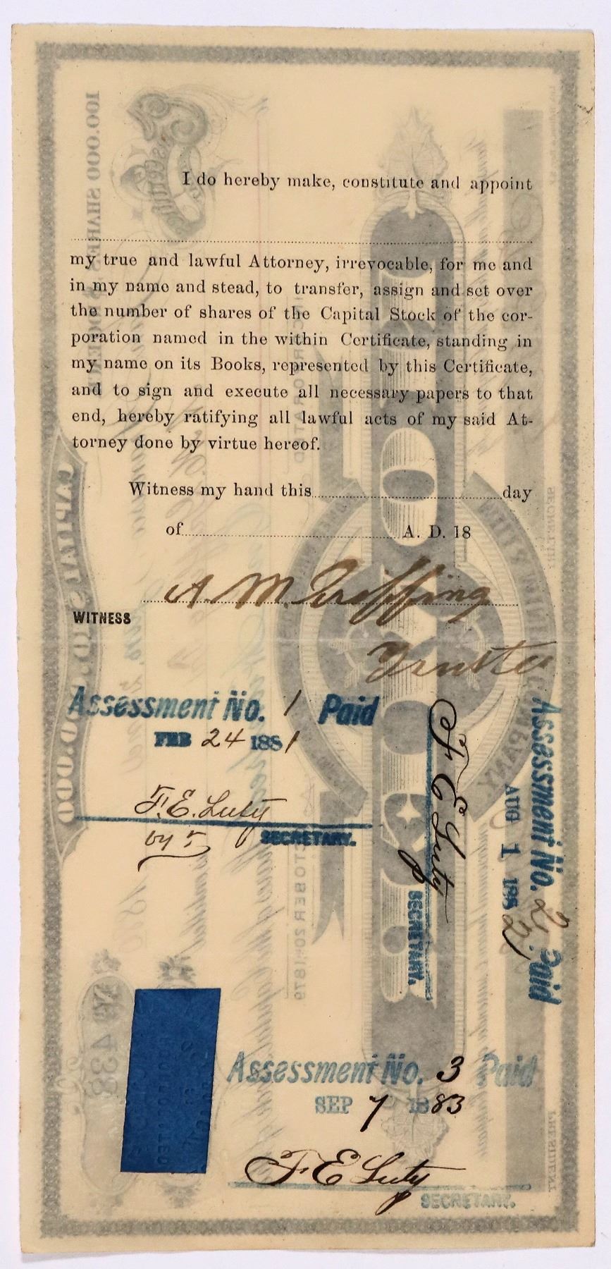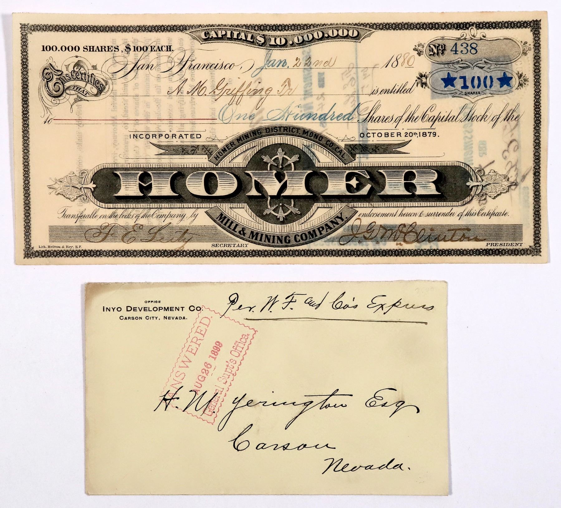 1880 Homer Mill & Mining stock. Inyo Development cover to H Yerington per W F and Co's Express, 1892 cover.