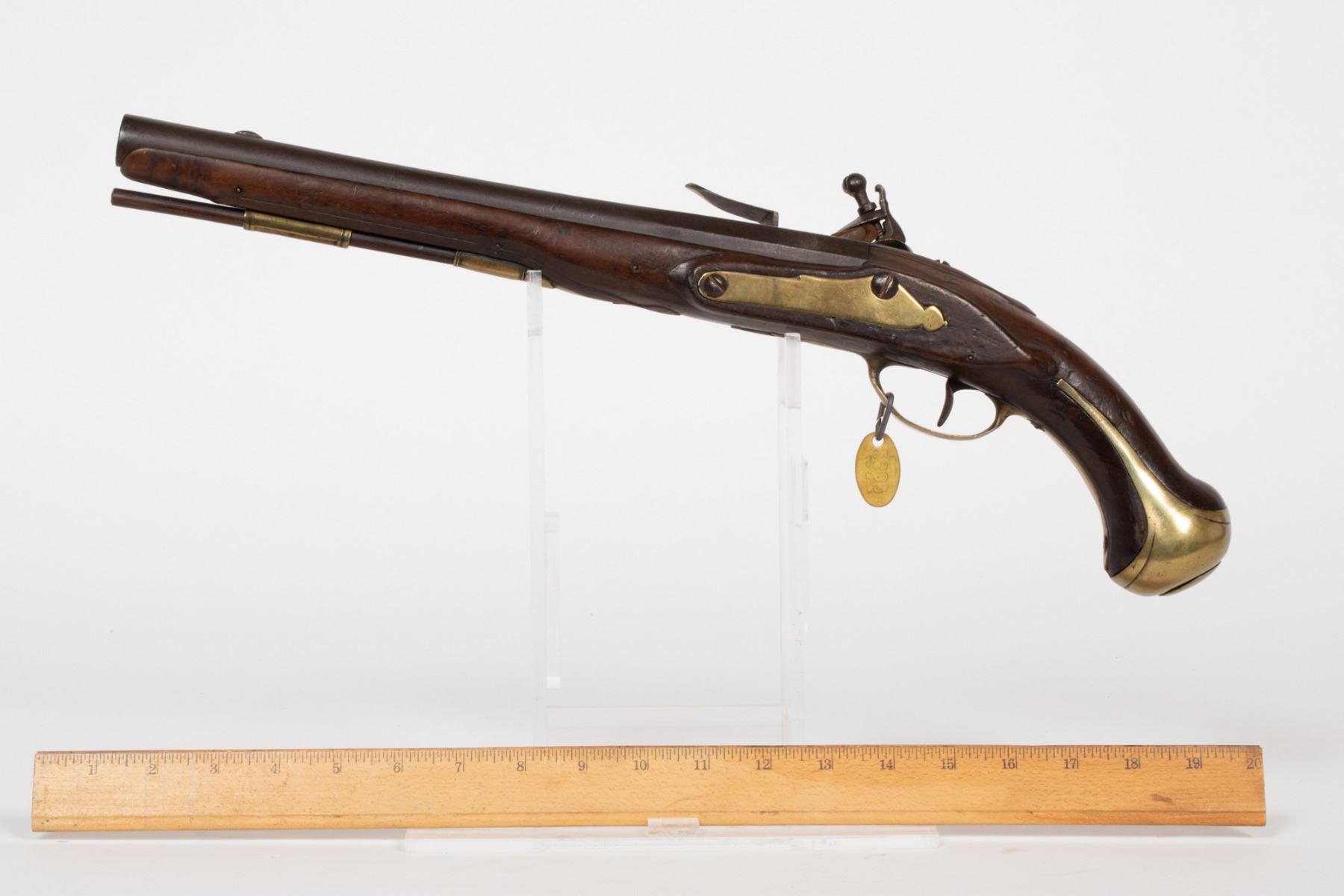 This is an American made flintlock pistol about 1750-1770's. Marked "Iovrion" on the lockplate. Mounted on a 12 in. barrel in American walnut. Brass hardware. In excellent condition at about .70 cal. SN: N/A, JMD Oval Tag: 2582, Condition: Excellent, >
