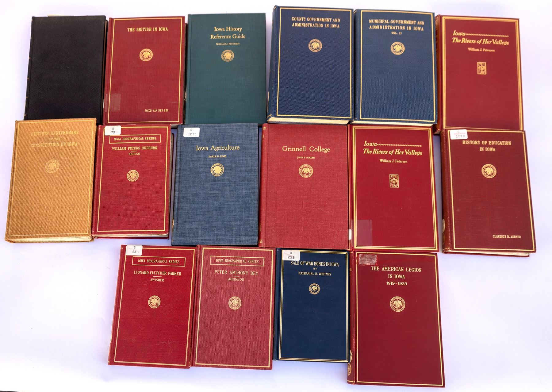 2x Iowa, The Rivers of Her Valleys by Petersen. Grinnell College by Nollen. Iowa Agriculture by Ross. Proceedings of the 15th Anniversary of the Constitution of Iowa. William Peters Hepburn by Briggs. Iowa Applied History Vols. IV and VI. The British in Iowa by Van Der Zee, The American Legion in Iowa by Swisher and more. State:Iowa City: Date: Provenance: Stuart Mackenzie Montana Ephemera Collection