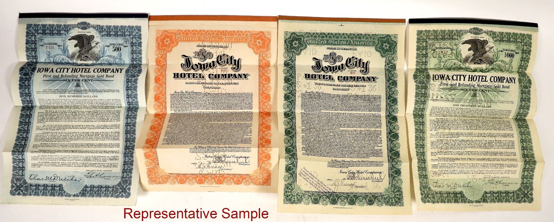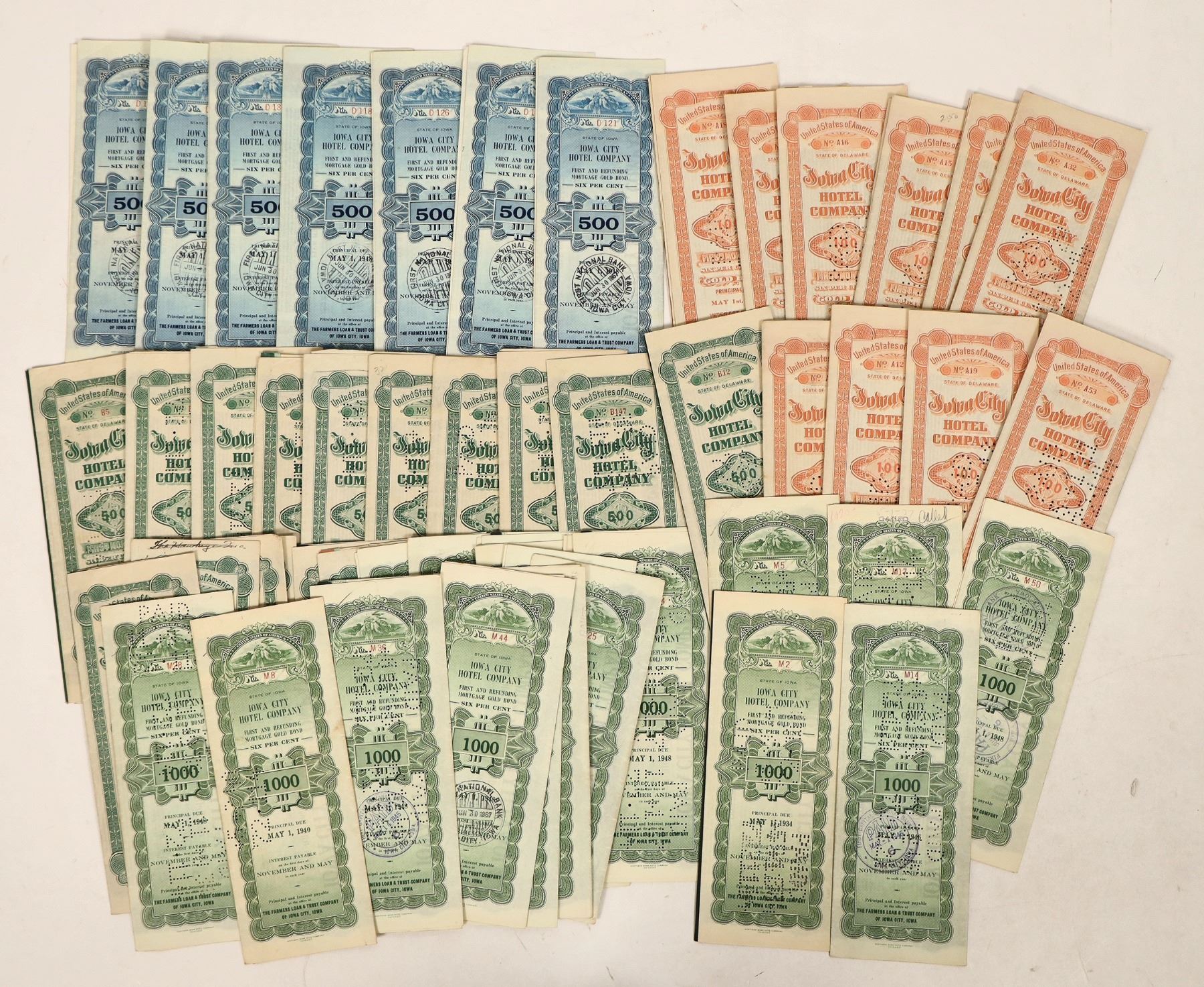 Iowa City Hotel bonds. 10x 1913 orange $100, 7x 1928 blue $500, 16x 1913 green $500, 18x 1928 green $1000.