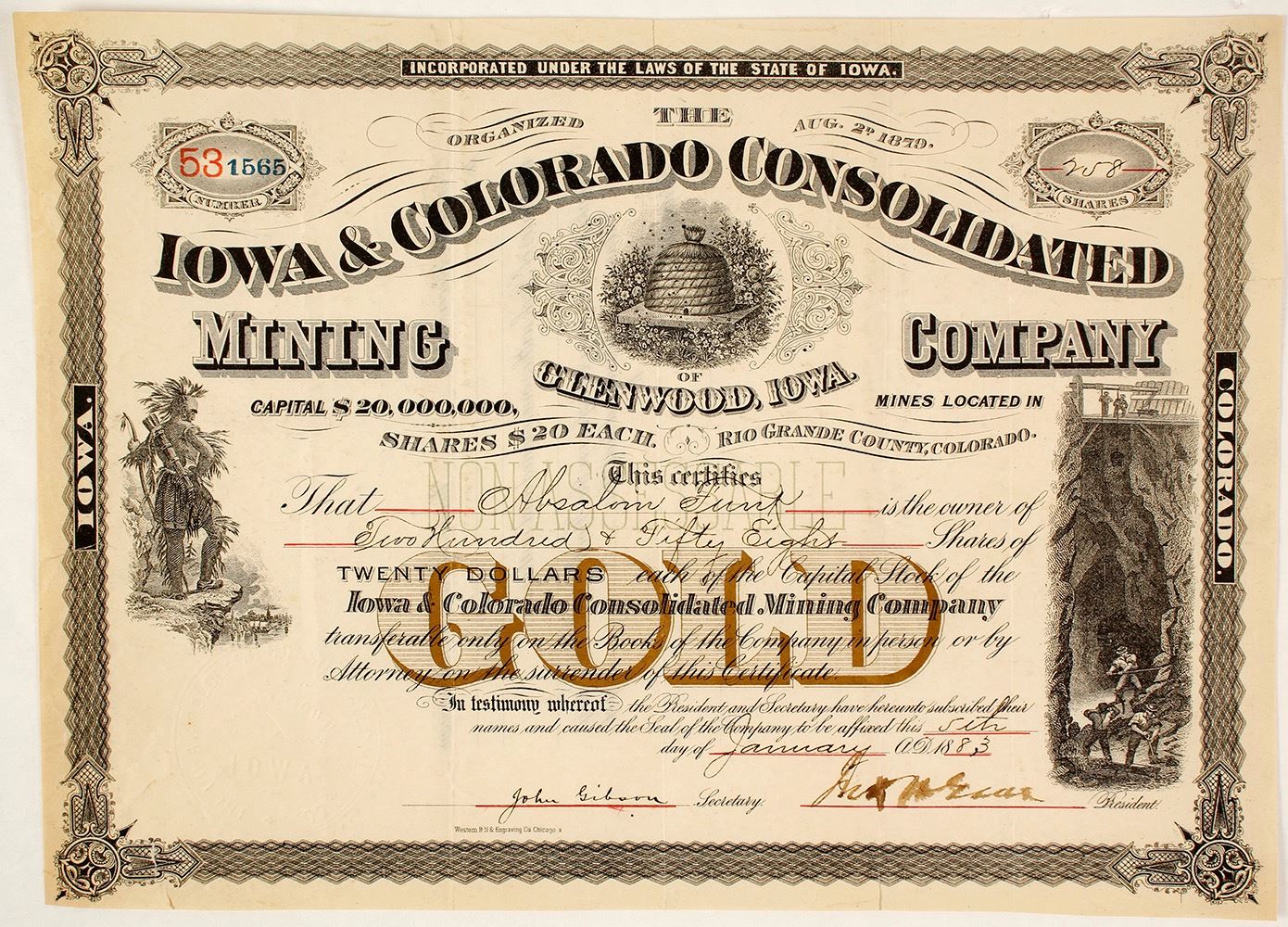 Inc. in Iowa. Mines Located in Rio Grande County, Colorado (printed on certificate). No. 531565, issued for 208 shares to Absalom Flint on Jan. 5th, 1883. Signed by the president (illegible) and secretary John Gibson. Not cancelled. Native American warrior vignette (left) and underground mining scene (right). Printed by Western BN & Engraving, Chicago. Folds, a few small (0.5") tears along the edges. Burchard (1882) classifies this company's property as "of the best character." He also gives a detailed description of the company's 50 stamp mill and the Iowa tunnel and tramway. By his 1884 report, he says the company is now idle; that they have 19 claims; that the main Iowa tunnel is in 1,300 feet. (Al Adams Gold Rush Memorabilia Collection) Date: Location: Rio Grande County, Colorado HWAC# 59056