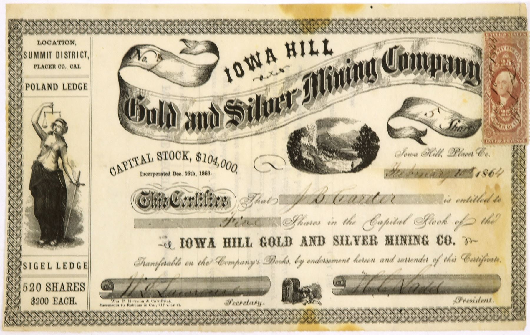 "Location, Summit District, Placer Co., Cal" (printed at upper left). "Sigel Ledge" (printed at bottom left). Inc. Dec. 16th, 1863. Low number 7, issued for 5 shares to JB Carder on February 10th, 1864. Dateline Iowa Hill, Placer Co. Signed by president HC Sadd and secretary Lawrence. Not cancelled. Black border and print. Vignette of bare breasted allegorical woman (left), Nature scene (center), and dog next to safe (bottom center). Printed by Wm. P. Harrison & Co. 25 cent adhesive revenue stamp attached at upper right. Folds, stains. 5.5 x 9" Iowa Hill is located 6.5 miles northwest of Foresthill, 9 miles east of Colfax and 58 miles northeast of Sacramento. It dates back to the California Gold Rush when miners from Iowa discovered gold in 1851 or 1852. In 1857, a fire destroyed about one hundred buildings in the central business district of the town, but no fatalities were recorded. The town was producing about one hundred thousand dollars per week in gold in 1867. In 1920, the town suffered another devastating fire. City:Iowa Hill, Placer County State:California Date:1864