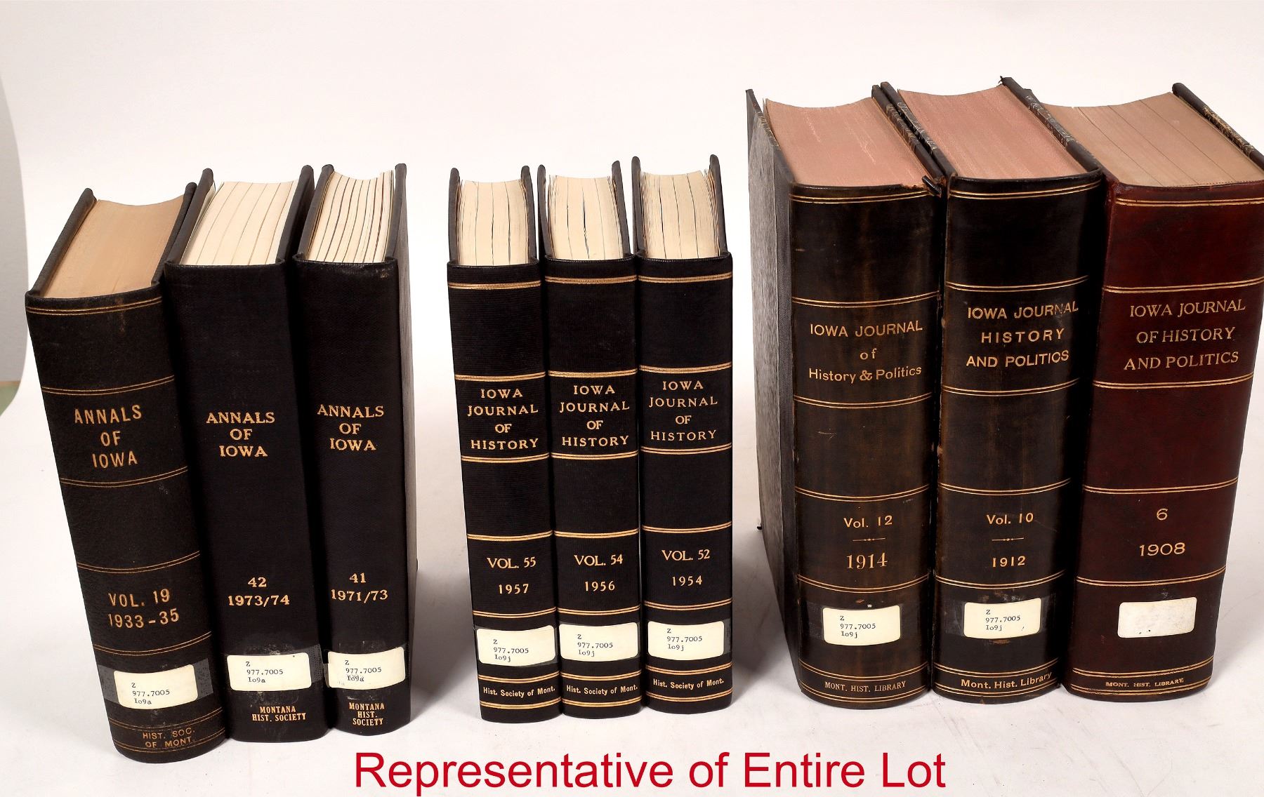 Hardcover collection of mostly Iowa journals, Many are ex-library. Annals of Iowa-Index's Vol 1-8, 9-16, 17-28. Volumes--1863 reprint(2), 1895-97, 1913-27, 1928-35, 1955-71, 1973-77. Iowa Journal of History and Politics. Index's 1903-42, 2 vols.1909-38, 1940-48. History of Iowa1947, 1950-60. Iowa Journal 1903-08. Iowa