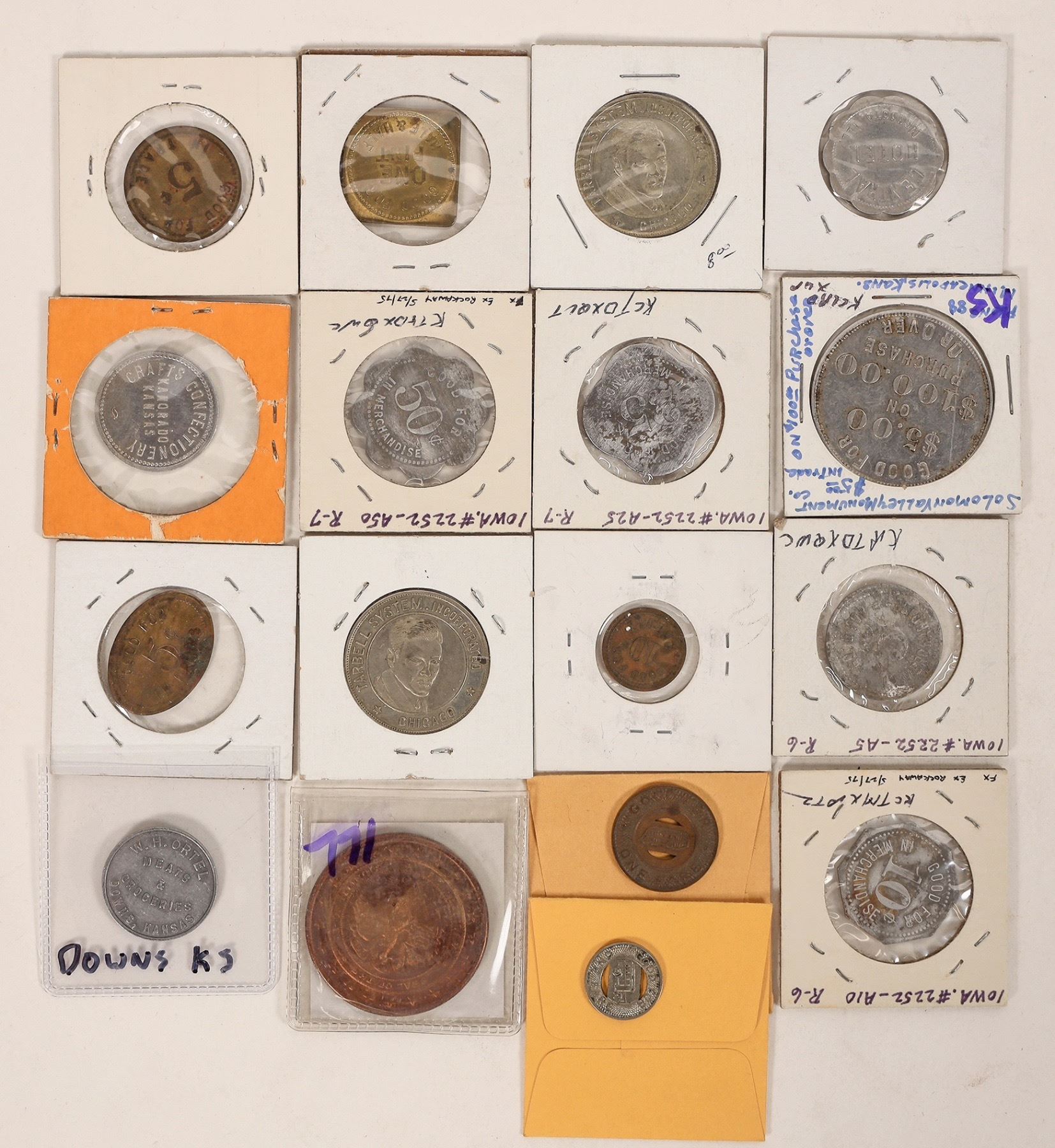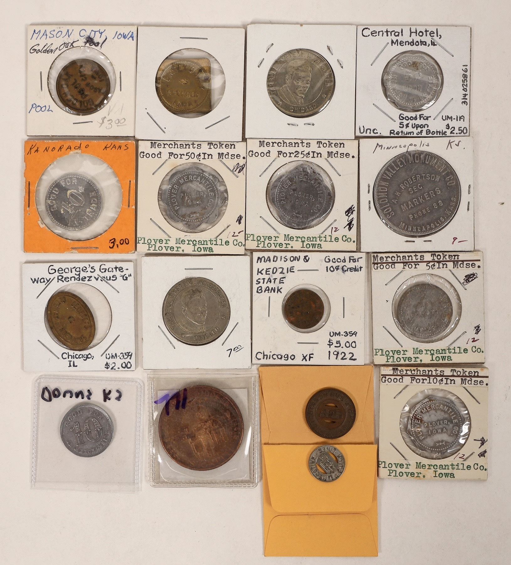 Merchant tokens and medals: Iowa (7): Mason City, Muscatine, Plover, Spencer; Illinois (6): Mendota, Chicago; Kansas (4): Hutchinson, Kanorado; Minneapolis; Downs. [