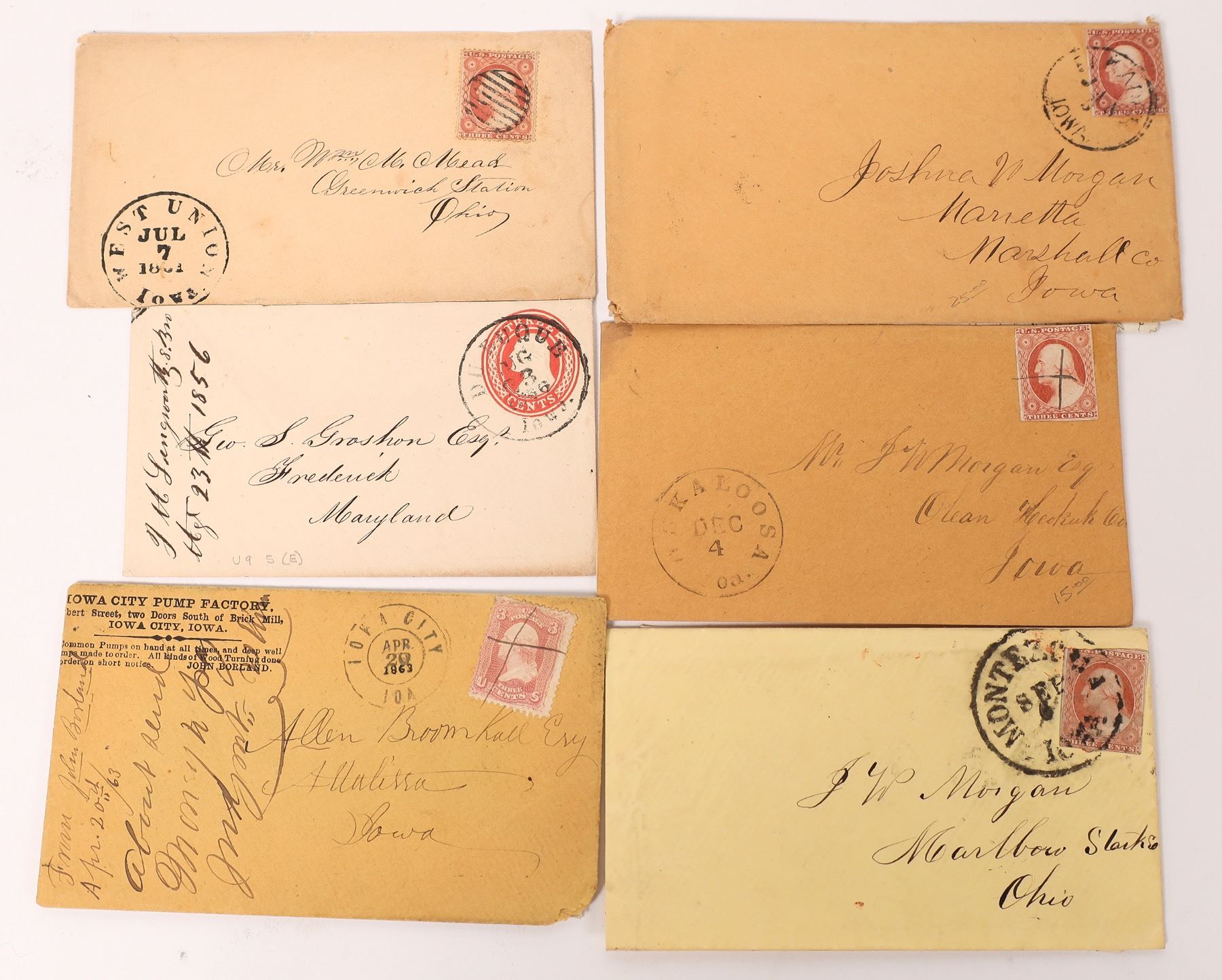 Lot of six; four with contents. 1850ís and 1860ís. Mostly 1862-63. 1) Montezuma. Postmark is cancel. Letter from Forrest Home. Much of it is work related. The Montezuma post office opened in 1849 making this less than ten years from opening. 2) Oskaloosa. Hand cancelled. The young lady is in serious financial condition. 3) Iowa City Double Circle that is hand cancelled. 1863. Corner advertising for the Iowa City Pump factory. More monetary issues. 4) Weak Elkader postmark which is also the cancel. 1857. Post office opened less than 10 years ago! Starts out with news of school. 5) 1861 West Union. Post office opened in 1850. Nice strike with bar cancel. 6) 1856 Dubuque. Postmark serves as cancel.