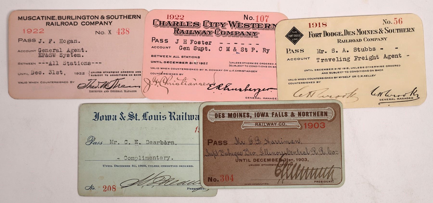 Five passes from Iowa Railroads: 1) 1903 Iowa & St. Louis Railway, No. 208, light blue; 2) 1903 Des Moines, Iowa Falls & Northern, No. 304, brown card stock; 3) 1918 Fort Dodge, Des Moines & Southern Railroad, No. 56, ivory card stock; 4) 1922 Charles City Western Railway Company, No. 107, pink color; 5) 1922 Muscatine, Burlington & Southern Railroad Company, No. 438, light pink. State:Iowa City: Date: Provenance: